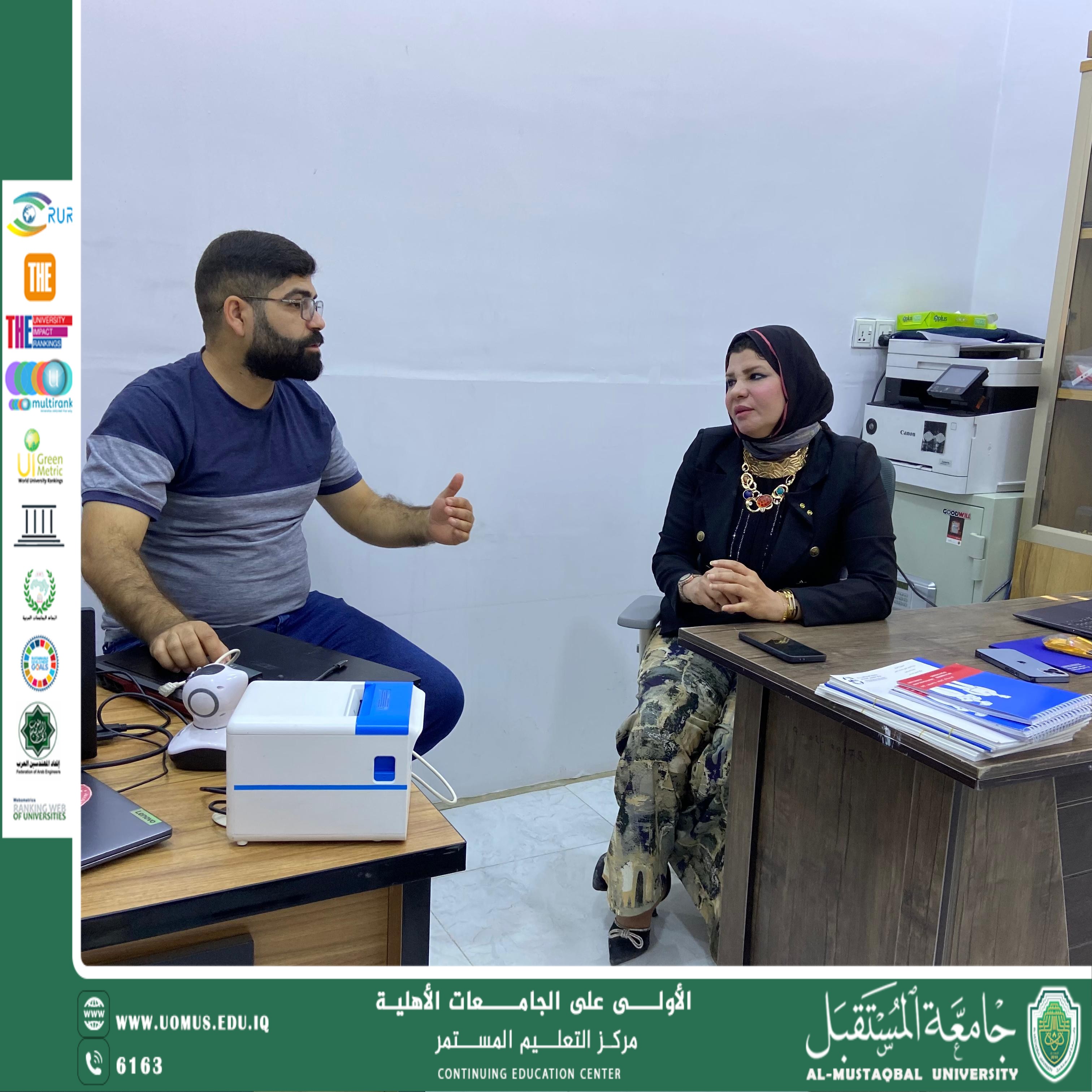 As part of the ongoing collaboration between specialized units within the university, the Center for Continuing Education at Al-Mustaqbal University hosted Asst. Lecturer Wameedh Diaa, representative of the Technology Incubator, who delivered a specialized session on the electronic system designed for the Center’s operations, attended by the Center’s administrative and technical staff.