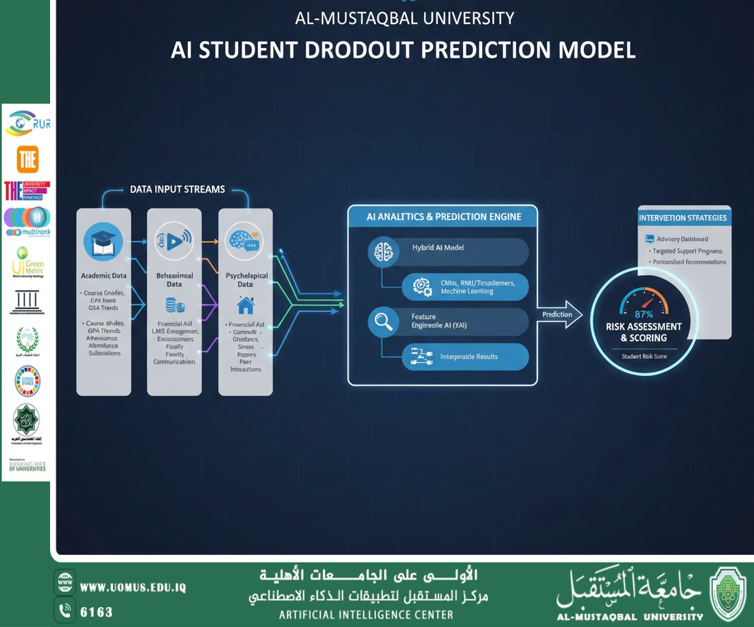 The proposed AI model represents a transformative and forward-thinking approach to proactively addressing the persistent challenge of student dropout at Al-Mustaqbal University. By intelligently leveraging advanced deep learning and predictive analytics, the university can shift from a reactive to a proactive paradigm, enabling it to better support students, enhance academic outcomes, and solidify its leadership position among private universities in Iraq [2]. The long-term success and ethical impact of such a sophisticated system will depend not only on its technical accuracy and predictive power but also on a unwavering commitment to ethical considerations, transparency in its operation, continuous validation in real-world academic settings, and a collaborative effort from all stakeholders. This initiative positions Al-Mustaqbal University at the forefront of educational innovation, creating a more personalized and supportive learning environment for every student.