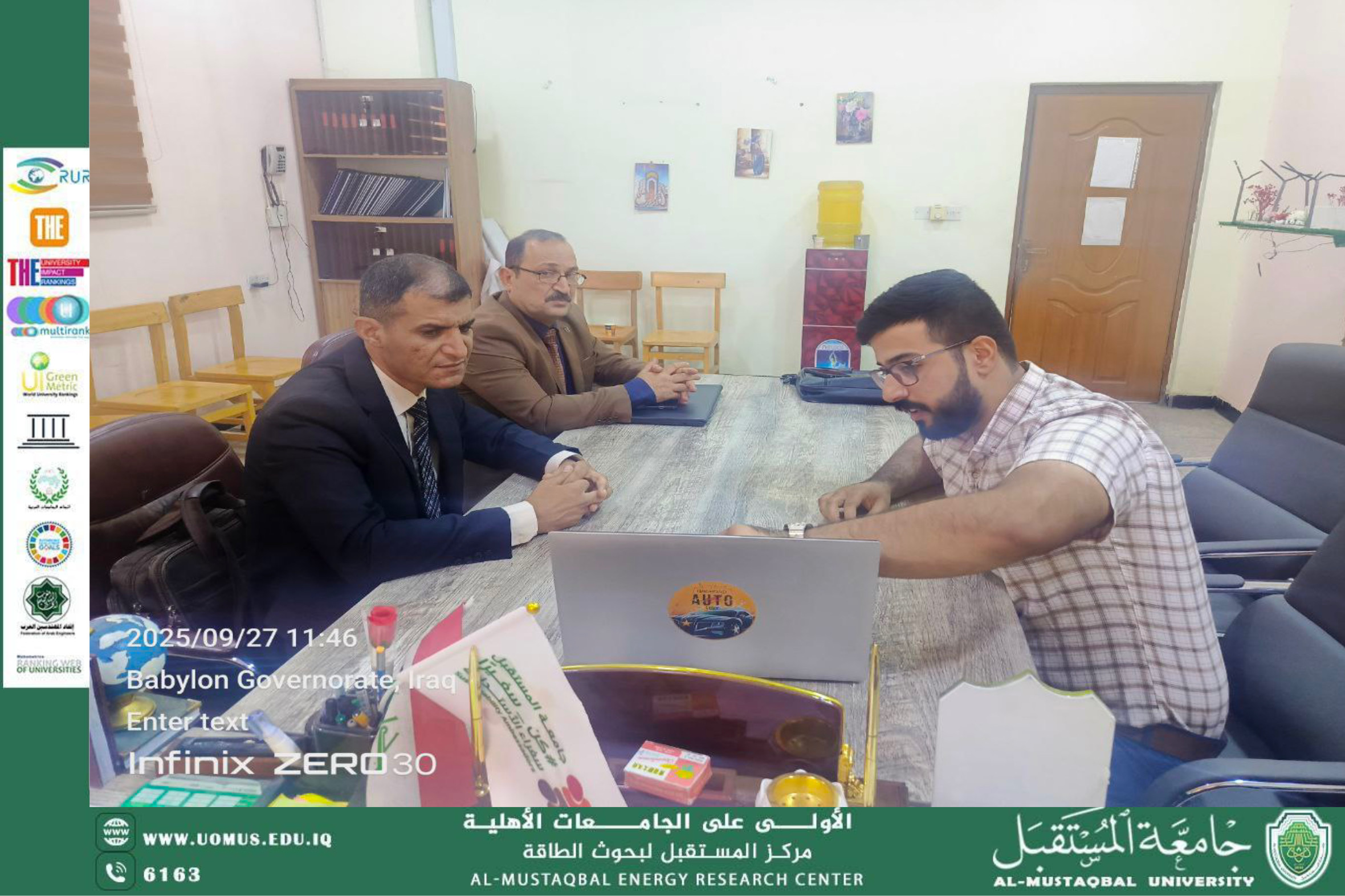 As part of its continuous efforts to attract distinguished academic competencies, Al-Mustaqbal Center for Energy Research conducted a scientific interview with Mr. Hameed Baqir, one of the applicants seeking an academic position at Al-Mustaqbal University. The interview was chaired by Prof. Dr. Salwan Obeid Waheed, Director of the Center, accompanied by Prof. Dr. Qusay Rasheed Abdulameer. During the session, the candidate delivered a detailed presentation highlighting the core aspects of his Master’s thesis, which focused on wind energy utilization and electricity generation through air turbines. His presentation demonstrated both scientific depth and clarity, emphasizing the crucial role of renewable energy in addressing challenges associated with conventional energy sources and supporting the global shift towards sustainable and clean energy solutions. Prof. Dr. Selwan stressed that Al-Mustaqbal University is keen to engage highly qualified academics capable of enriching the fields of research and teaching, noting that such interviews are part of the Center’s mission to select the most suitable academic figures who can positively contribute to students’ learning outcomes and enhance the university’s research profile. For his part, Mr. Baqir expressed his eagerness to be part of Al-Mustaqbal University’s academic journey, confirming his readiness to apply his research expertise in serving both students and the Center, particularly in the field of renewable energy studies and practical applications. This initiative reflects the commitment of Al-Mustaqbal Center for Energy Research to adopting a rigorous academic approach in selecting candidates, thereby reinforcing the University’s standing as a pioneering institution dedicated to keeping pace with scientific advancements, especially in the vital field of renewable and clean energy.