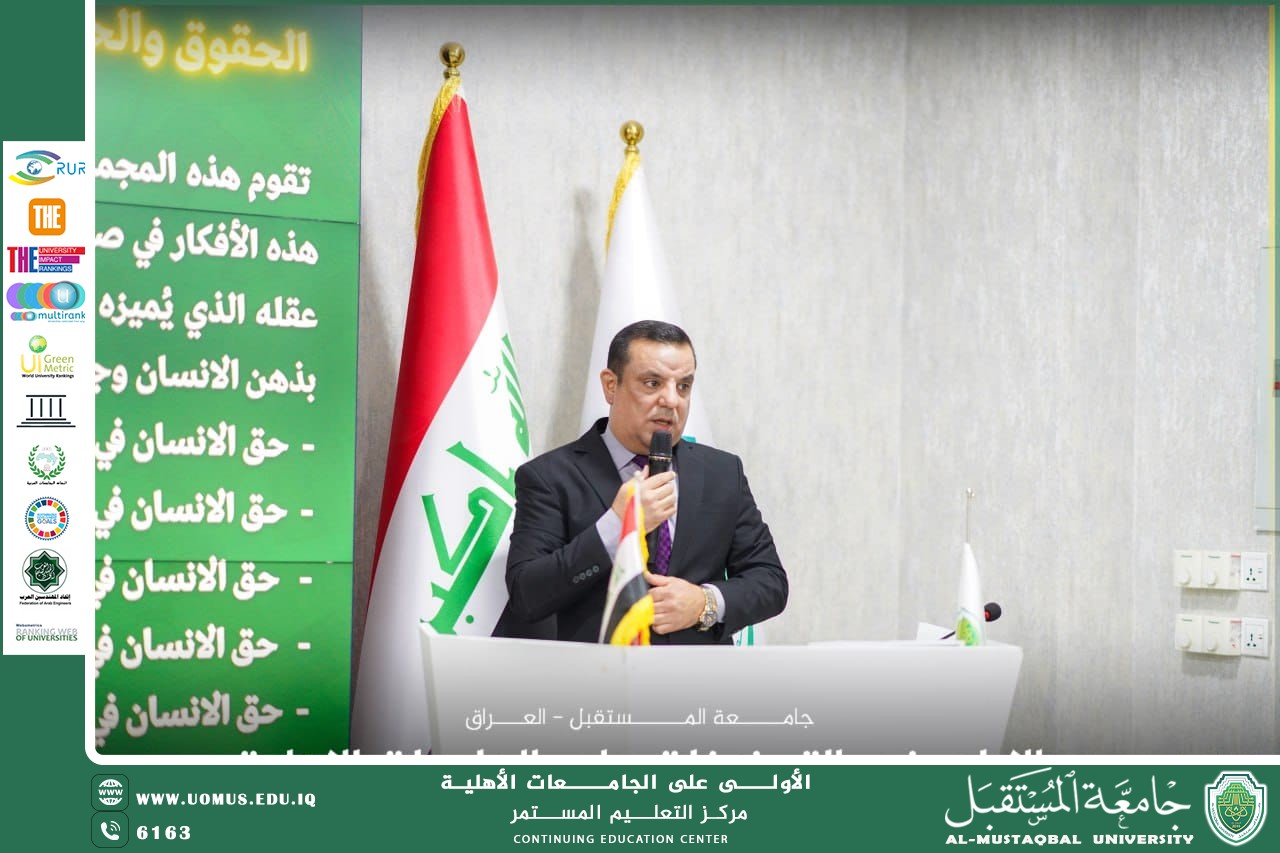 Under the generous patronage of Prof. Dr. Hassan Shaker Majdi, President of Al-Mustaqbal University, and as part of the university’s efforts to enhance institutional accreditation and develop the scientific and intellectual capacities of its faculty and staff, the Center for Continuing Education organized a scientific workshop entitled “Human Rights.”