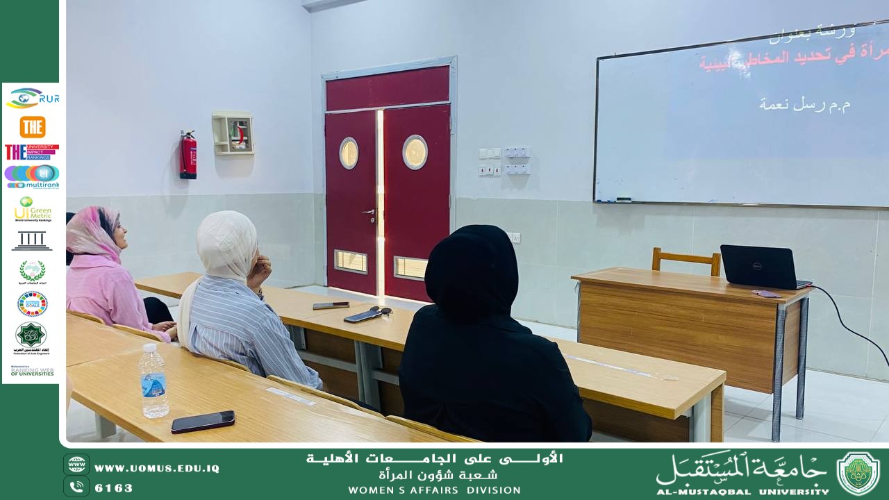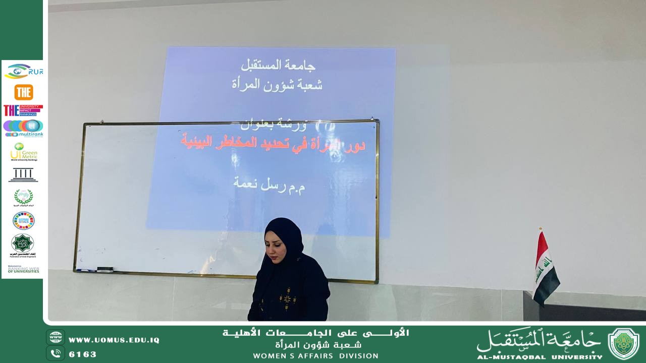 As part of its efforts to promote environmental awareness, the Women’s Affairs Division at Al-Mustaqbal University organized a workshop on August 23, 2025, entitled “The Role of Women in Identifying Environmental Risks.” The workshop was delivered by Asst. Lecturer Rusul Naama Kamal from the College of Arts and Humanities, with the attendance of several faculty members.