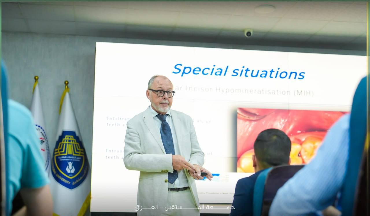 Al-Mustaqbal University welcomed the French visiting expert Stephan Diaz in a specialized training workshop entitled “Zero Pain Dentistry”, sponsored by Aplal International – Baghdad/Al-Mansour Branch, with the participation of faculty members and students from the College of Dentistry.