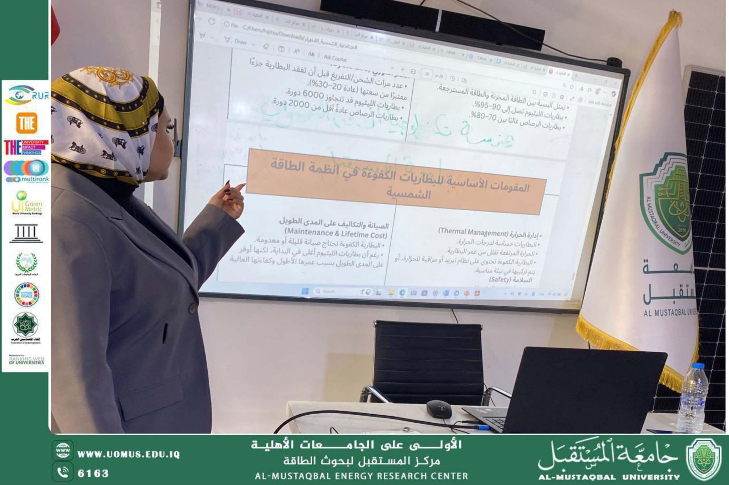 The Al-Mustaqbal Energy Research Center continues its training activities within the “Solar Energy Hackathon”, attracting wide participation from students and renewable energy enthusiasts, in an interactive academic environment that combines theoretical learning with practical applications. In one of the specialized sessions, researcher Israa Mohammed Hassan delivered an in-depth lecture on the components of photovoltaic solar energy systems, emphasizing the key principles and requirements to consider when designing or installing solar power systems—whether for residential use or for equipping offices, institutions, and companies. The lecture provided detailed insights into the main system components, including solar panels, charge controllers, batteries, and inverters, highlighting the vital role each part plays in ensuring efficiency and long-term reliability. Researcher Israa also stressed the importance of adhering to proper technical standards to avoid common installation mistakes, thereby enhancing both performance and durability of solar systems. These lectures come as part of the broader Solar Energy Hackathon competition, which aims to equip students with practical knowledge and hands-on experience in renewable energy, preparing a new generation of professionals to contribute effectively to the global shift toward sustainable, clean energy solutions. ,