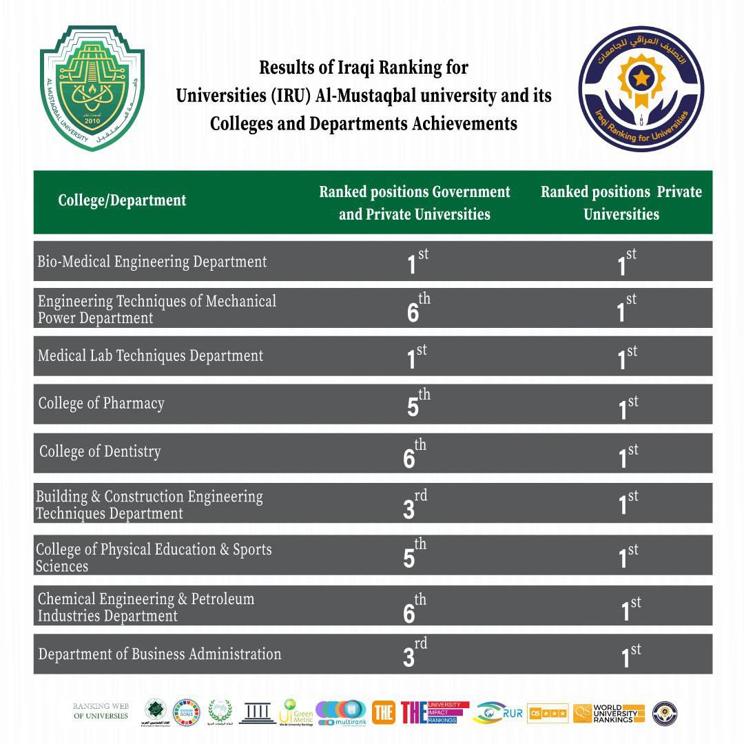 تصدرت جامعة المستقبل قائمة الجامعات الحكومية والأهلية بأقسامها المتميزة التي حصلت على المراتب الأولى، ومن أبرزها: