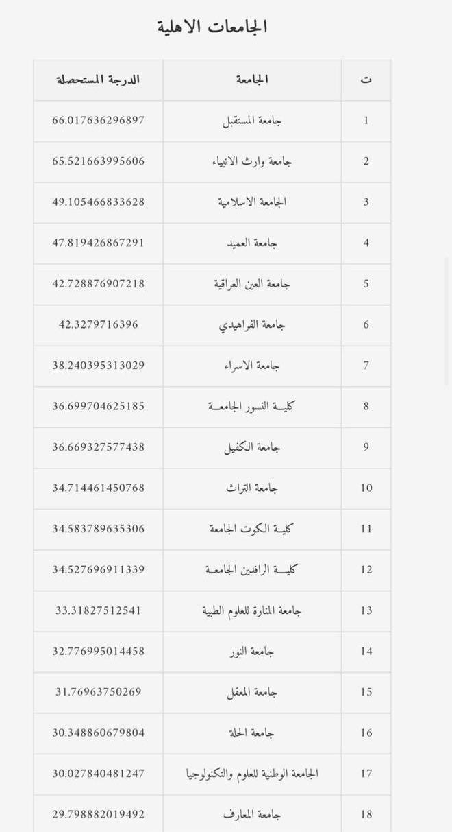 أعلنت وزارة التعليم العالي والبحث العلمي، جهاز الإشراف والتقويم العلمي، عن نتائج التصنيف الوطني العراقي للجامعات، حيث حققت جامعة المستقبل المرتبة الأول على مستوى الجامعات و الكليات الاهلية ، مؤكدة مكانتها كأفضل جامعة على مستوى العراق.