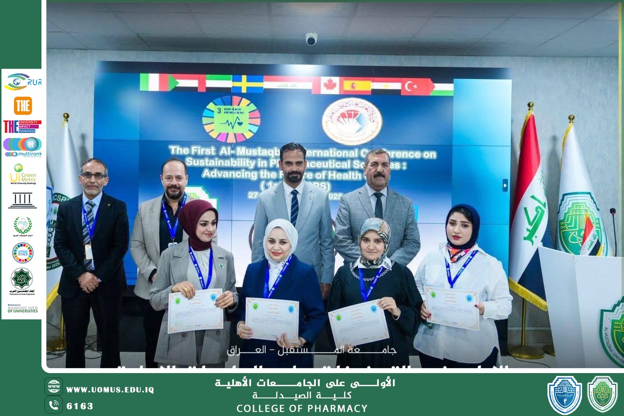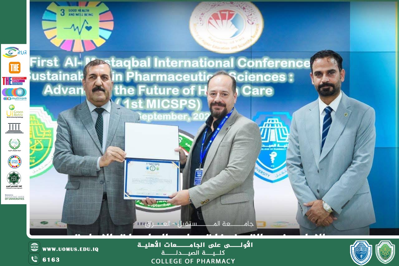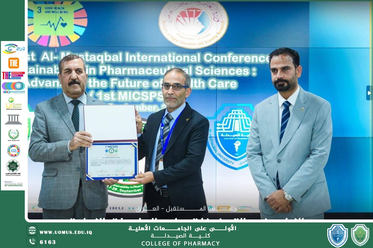كرّم الأستاذ المساعد الدكتور أحمد خالد الظالمي، عميد كلية الصيدلة بجامعة المستقبل، عدداً من تدريسيي الكلية وكوادرها تقديراً لمشاركتهم الفاعلة ومساهمتهم المتميزة في إنجاح فعاليات المؤتمر الدولي الأول للاستدامة في العلوم الصيدلانية الذي نظمته الكلية.