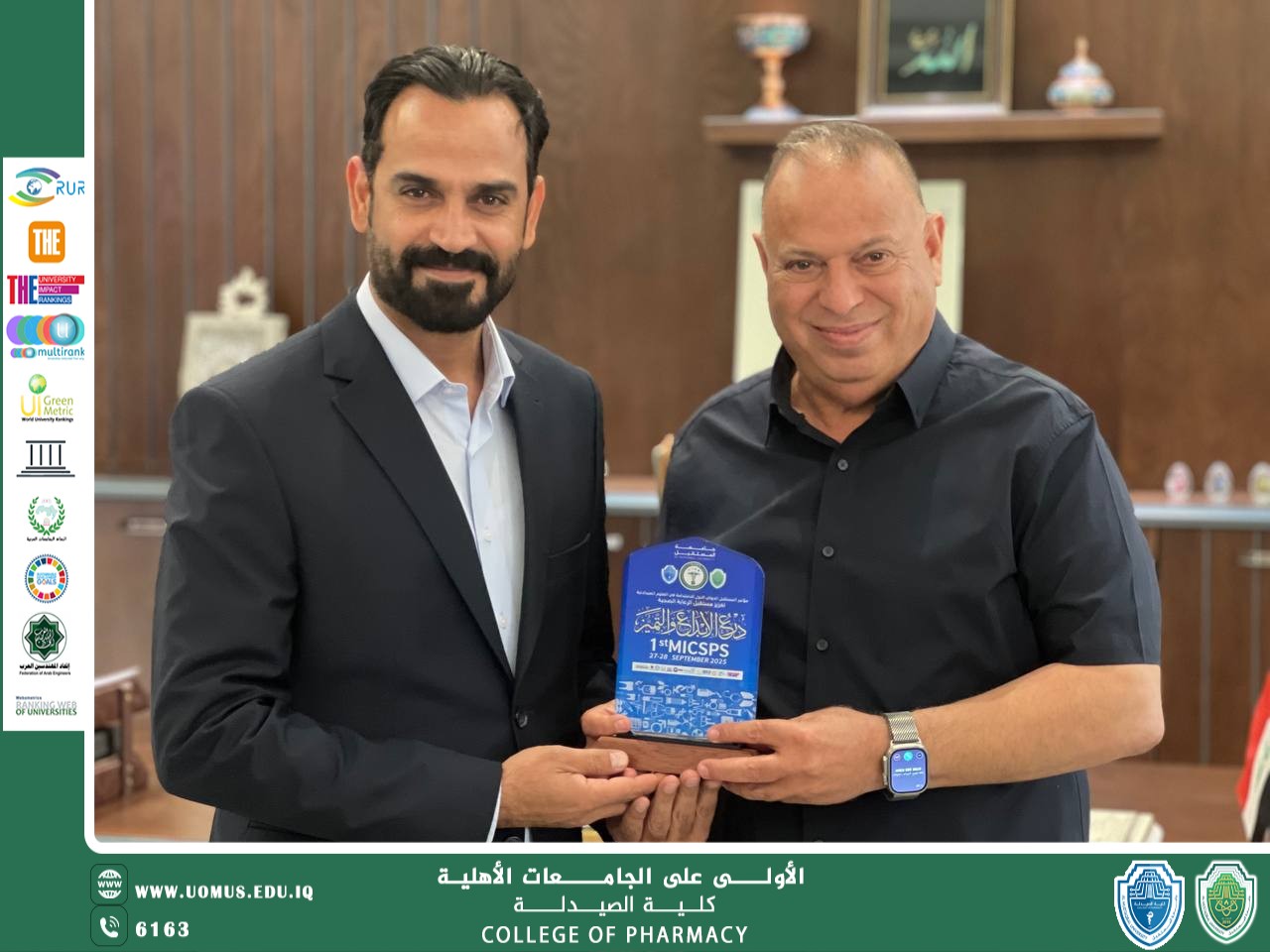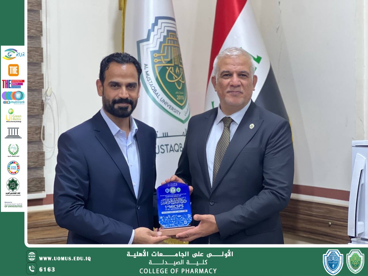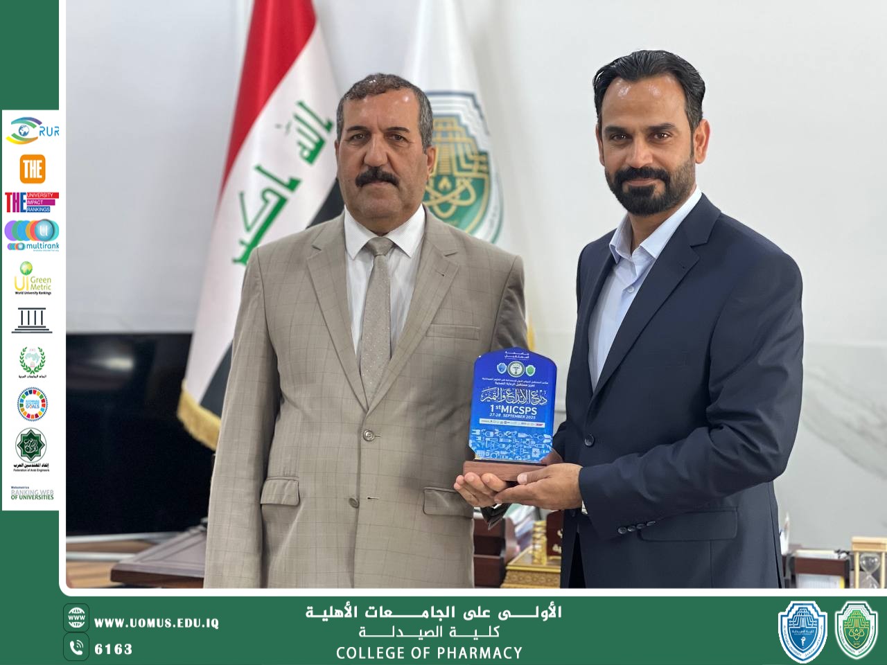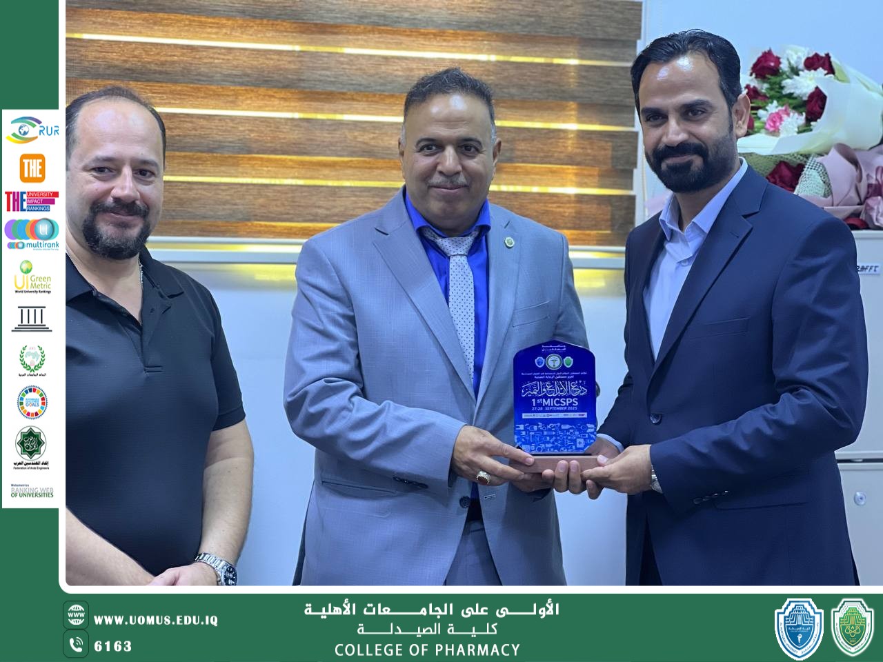 وجاء هذا التكريم تعبيراً عن التقدير العميق والامتنان البالغ لما قدمته هذه القيادات من دعمٍ ورعايةٍ متواصلة للمسيرة الأكاديمية والعلمية في الجامعة، ومساهمتهم الفاعلة في إنجاح المؤتمر الدولي الذي يُعد خطوة رائدة نحو تعزيز مفهوم الاستدامة في العلوم الصيدلانية في العراق والمنطقة.