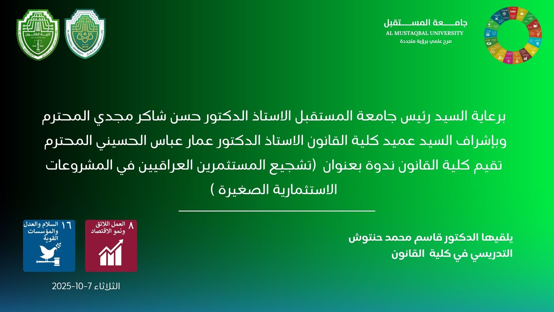 برعاية السيد رئيس جامعة المستقبل الأستاذ الدكتور حسن شاكر مجدي المحترم، وبإشراف السيد عميد كلية القانون الأستاذ الدكتور عمار عباس الحسيني المحترم، نظّمت كلية القانون ندوة حوارية بعنوان: "تشجيع المستثمرين العراقيين في المشروعات الاستثمارية الصغيرة"، وذلك يوم الثلاثاء الموافق 7/10/2025 على قاعة الكلية – البناية الإنسانية.