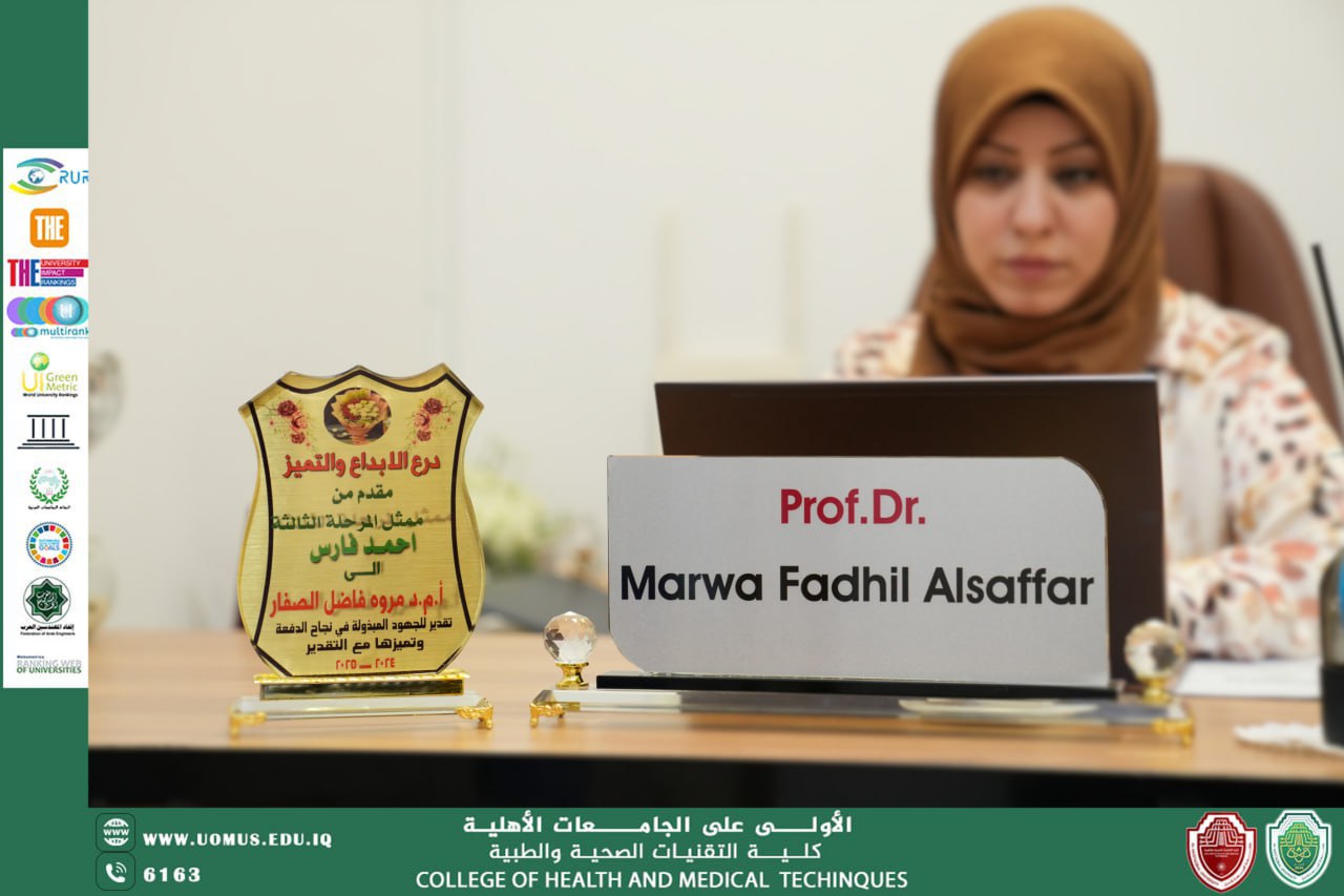 تواصلت في كلية التقنيات الصحية والطبية – جامعة المستقبل زيارات المهنئين إلى الأستاذ الدكتورة مروة فاضل عبد الكريم الصفار بمناسبة ترقيتها العلمية وحصولها على لقب الأستاذية، في أجواء يسودها الاعتزاز والتقدير لمسيرتها الأكاديمية والعلمية المتميزة.