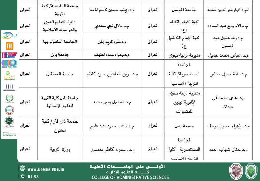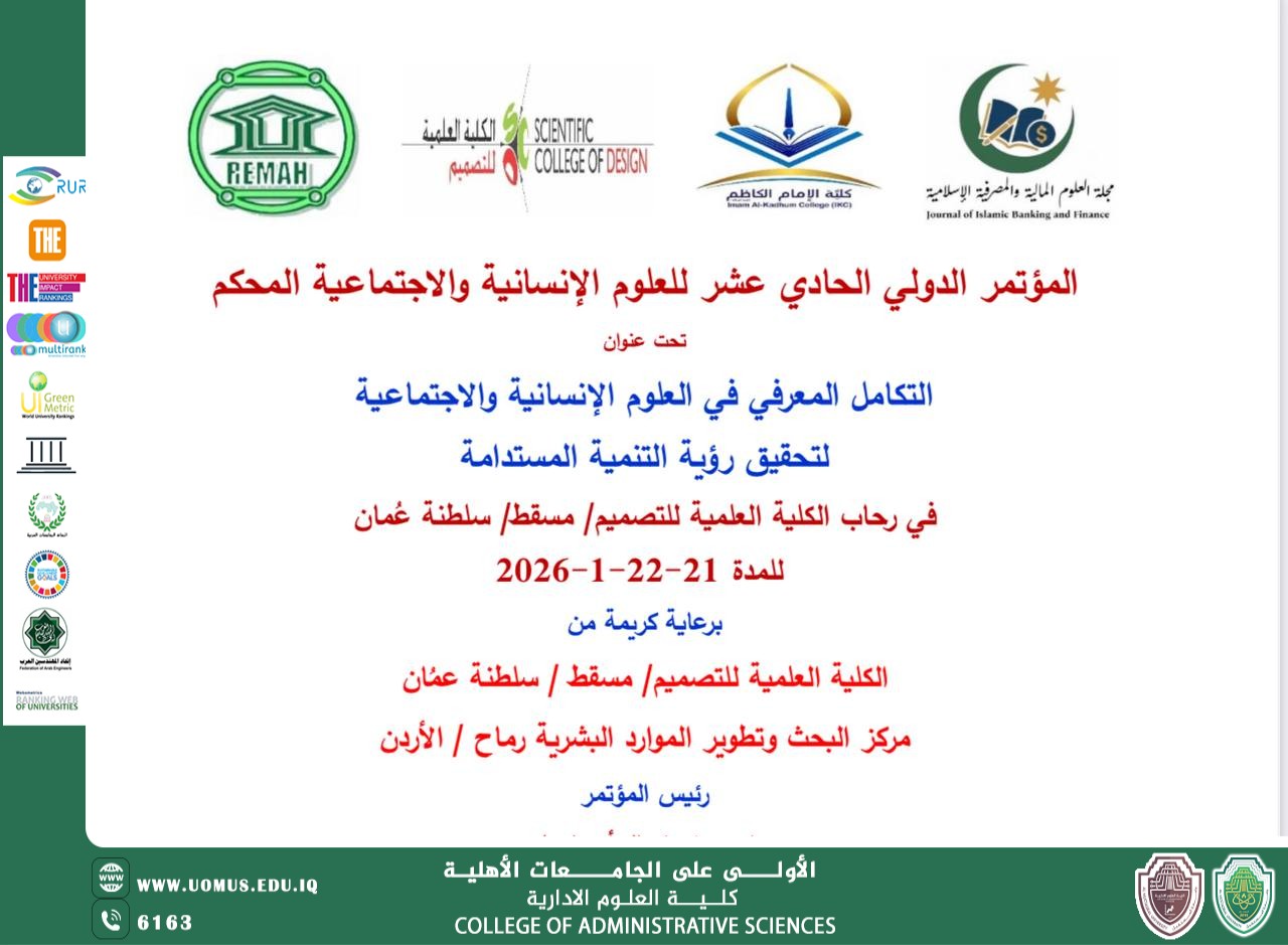 في إطار الحضور الأكاديمي المتميز لجامعة المستقبل على المستويين الإقليمي والدولي، تم اختيار التدريسيين في كلية العلوم الإدارية م.د زين العابدين عبود كاظم وم.د علي محمد حسين الفرطوسي ضمن اللجان المشاركة في المؤتمر الدولي الحادي عشر للعلوم الإنسانية والاجتماعية المحكَّم، الذي تنظمه الكلية العلمية في مسقط – سلطنة عُمان خلال الفترة من 21 – 22 يناير 2026، تحت شعار: