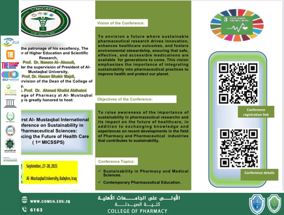 يسر كلية الصيدلة – جامعة المستقبل ان تدعوكم لحضور مؤتمرها الدولي الاول الموسوم ( مؤتمر المستقبل الدولي الاول للاستدامة في العلوم الصيدلانية: تعزيز مستقبل الرعاية الصحية) والذي سيقام في رحاب جامعة المستقبل للفترة 27-28ايلول 2025