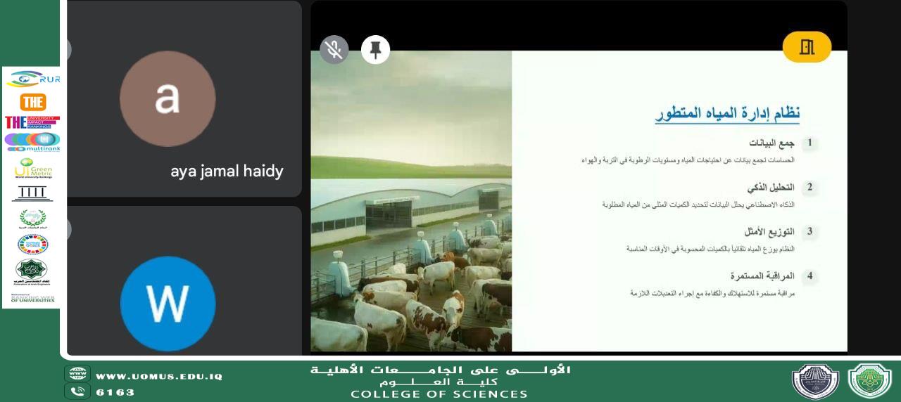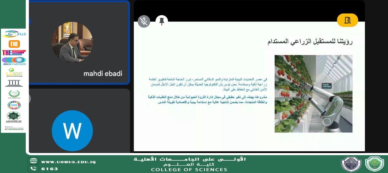 برعاية السيد رئيس جامعة المستقبل الأستاذ الدكتور حسن شاكر مجدي المحترم، وبإشراف مباشر من عميد كلية العلوم الأستاذ المساعد الدكتور فرات حمزة السلطاني المحترم، أقامت كلية العلوم – قسم الأنظمة الطبية الذكية ورشة عمل بعنوان "إدارة الثروة الحيوانية عبر أنظمة ذكية لتحقيق الأمن الغذائي المستدام" ألقاها الأستاذ الدكتور مهدي عبادي مانع، رئيس قسم الأنظمة الطبية الذكية، وذلك يوم الأربعاء الموافق 24/9/2025 عبر منصة Google Meet في تمام الساعة 8 مساءً.