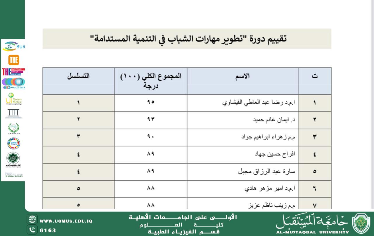 وقد تمكنت السيدة أفراح حسين جهاد من تحقيق درجة 89%، مما منحها التسلسل الرابع بين المشاركين، وحصلت على شهادة مشاركة تقديرًا لجهودها المتميزة في البرنامج.