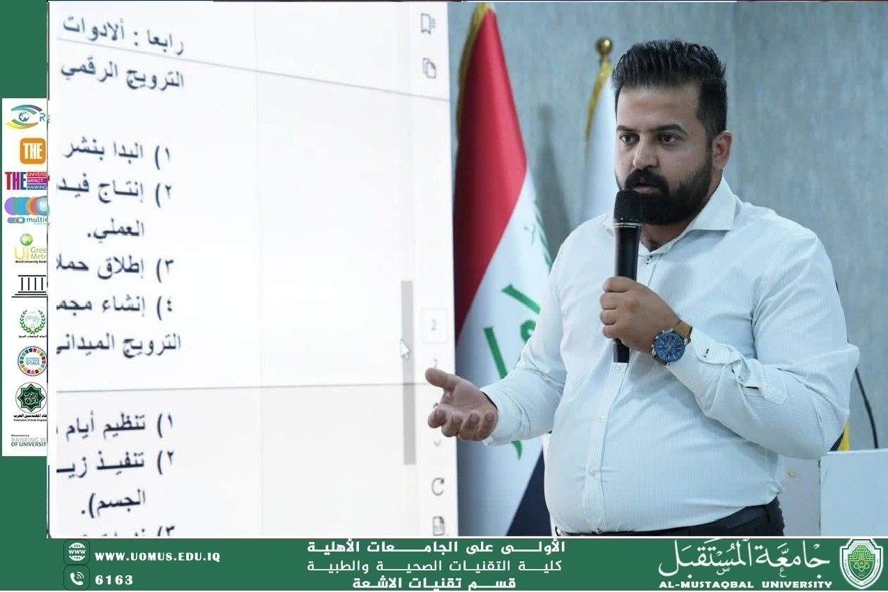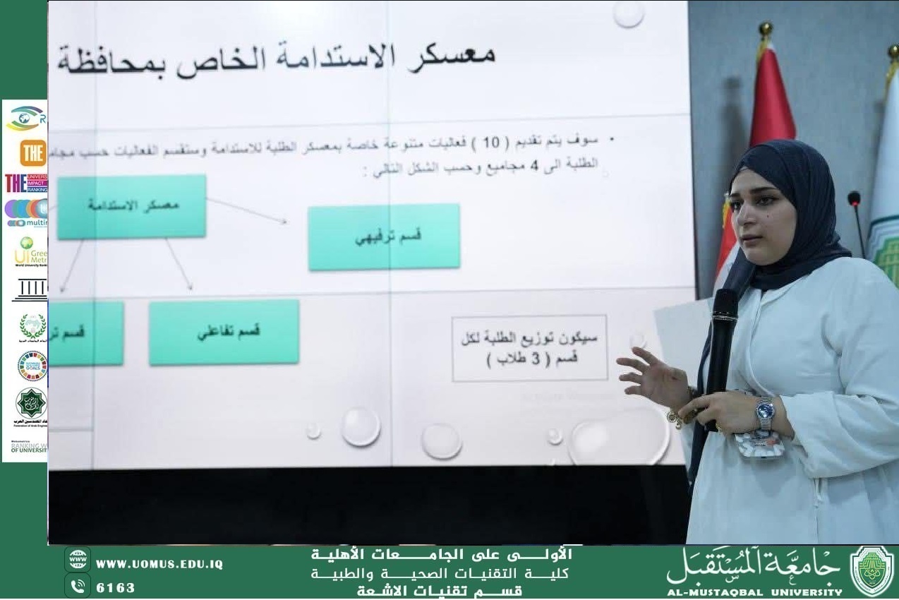 عقدت كلية التقنيات الصحية والطبية في جامعة المستقبل اجتماعاً تخصصياً لمناقشة خطط الأقسام العلمية الخاصة بالمشاركة في معسكر الاستدامة، وذلك برئاسة الأستاذ المساعد الدكتور علي شاكر مجدي، معاون العميد للشؤون العلمية، وبحضور رؤساء الأقسام العلمية ومسؤولي الأنشطة وجمع من الطلبة.
