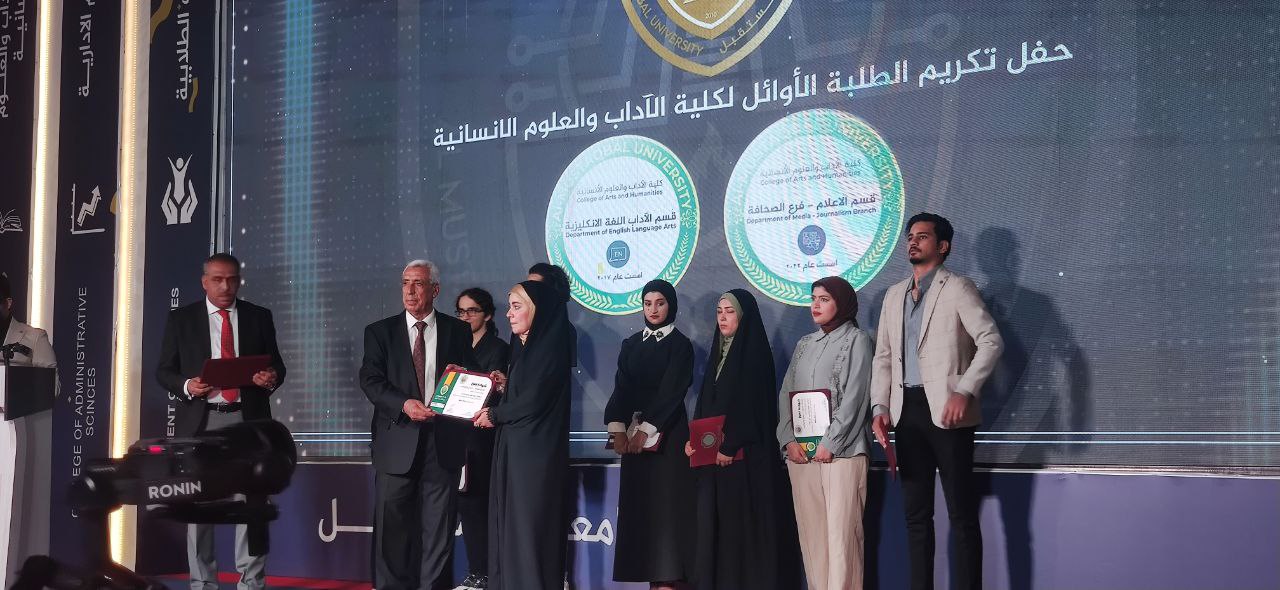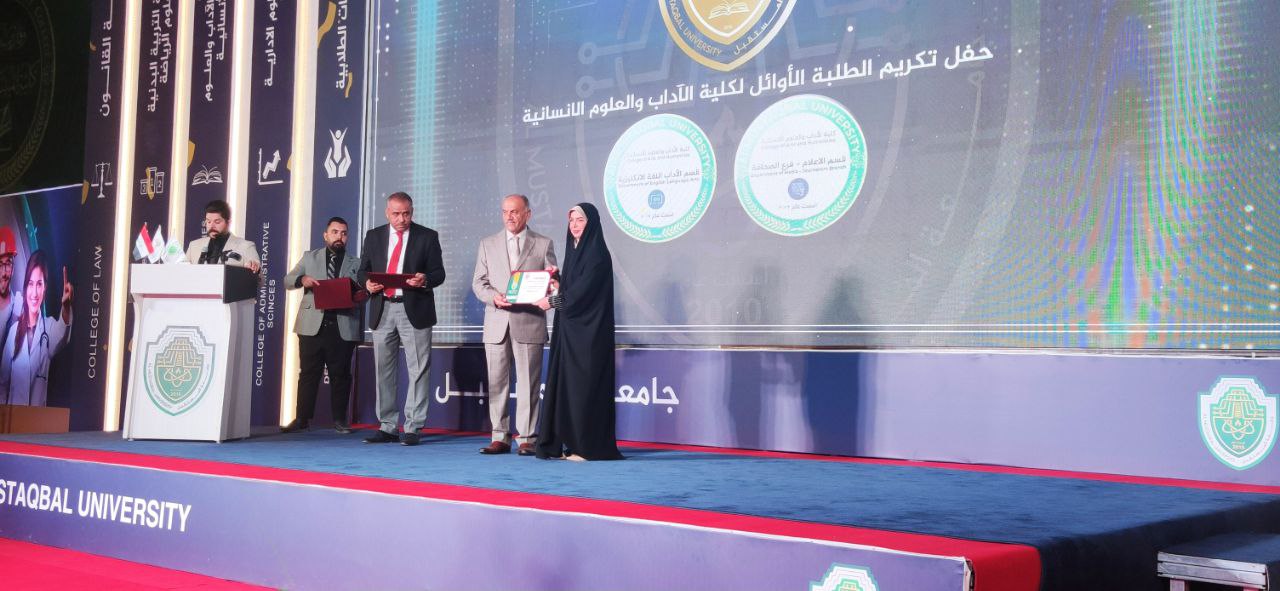 برعاية السيد رئيس جامعة المستقبل الاستاذ الدكتور حسن شاكر مجدي المحترم والسيد عميد كلية الاداب والعلوم الانسانية الاستاذ الدكتور حسين وحيد عزيز اقيمت احتفالية كبرى على قاعة كلية التربية الرياضية يوم الاثنين الموافق 23/10/2023 للاحتفاء بتأسيس الكلية في عامها الاول وتكريم الطلبة الاوائل الثلاثة في المراحل الدراسية كافة لقسم اللغة الانكليزية وكان حفلاً بهيجاً حضره طلبة القسم وعوائلهم الكريمه
