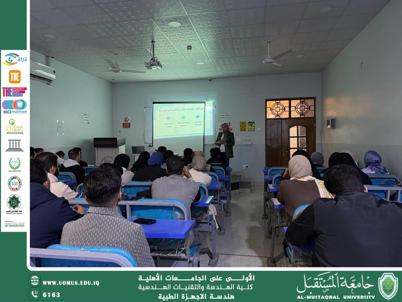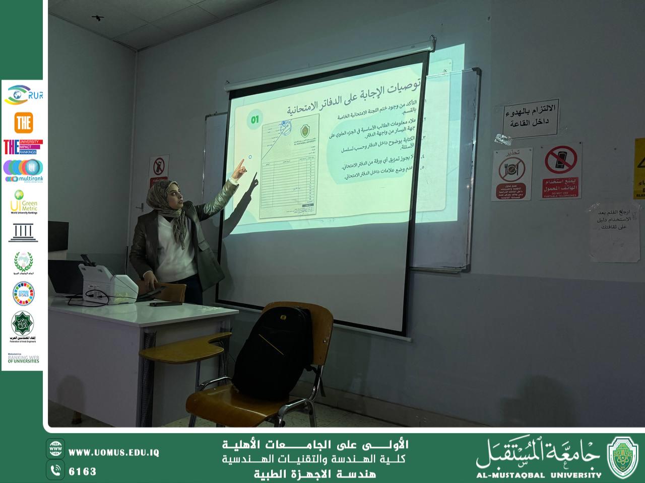 نظّمت اللجنة الامتحانية في قسم هندسة تقنيات الأجهزة الطبية ، اليوم 11 فبراير 2025، ورشة تعليمية لشرح التعليمات الواجب اتباعها لضمان بيئة امتحانية عادلة ومنظمة. أكّدت الورشة على ضرورة الحضور قبل 15 دقيقة من بدء الامتحان، مع منع دخول الطلبة بعد مرور 30 دقيقة، وحظر اصطحاب الأجهزة الإلكترونية.