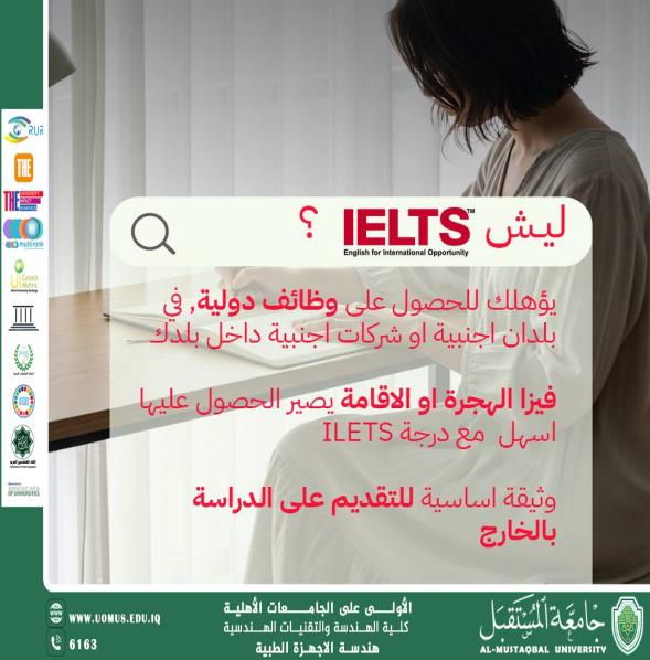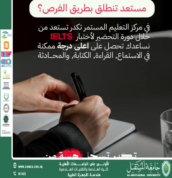 يعلن مركز التعليم المستمر عن إطلاق دورة التحضير لاختبار IELTS، المصممة خصيصًا لمساعدة الطلاب والمهنيين على الوصول إلى مستوى متقدم في اللغة الإنجليزية وإثبات استعدادهم للمنافسة الأكاديمية والمهنية على حد سواء.