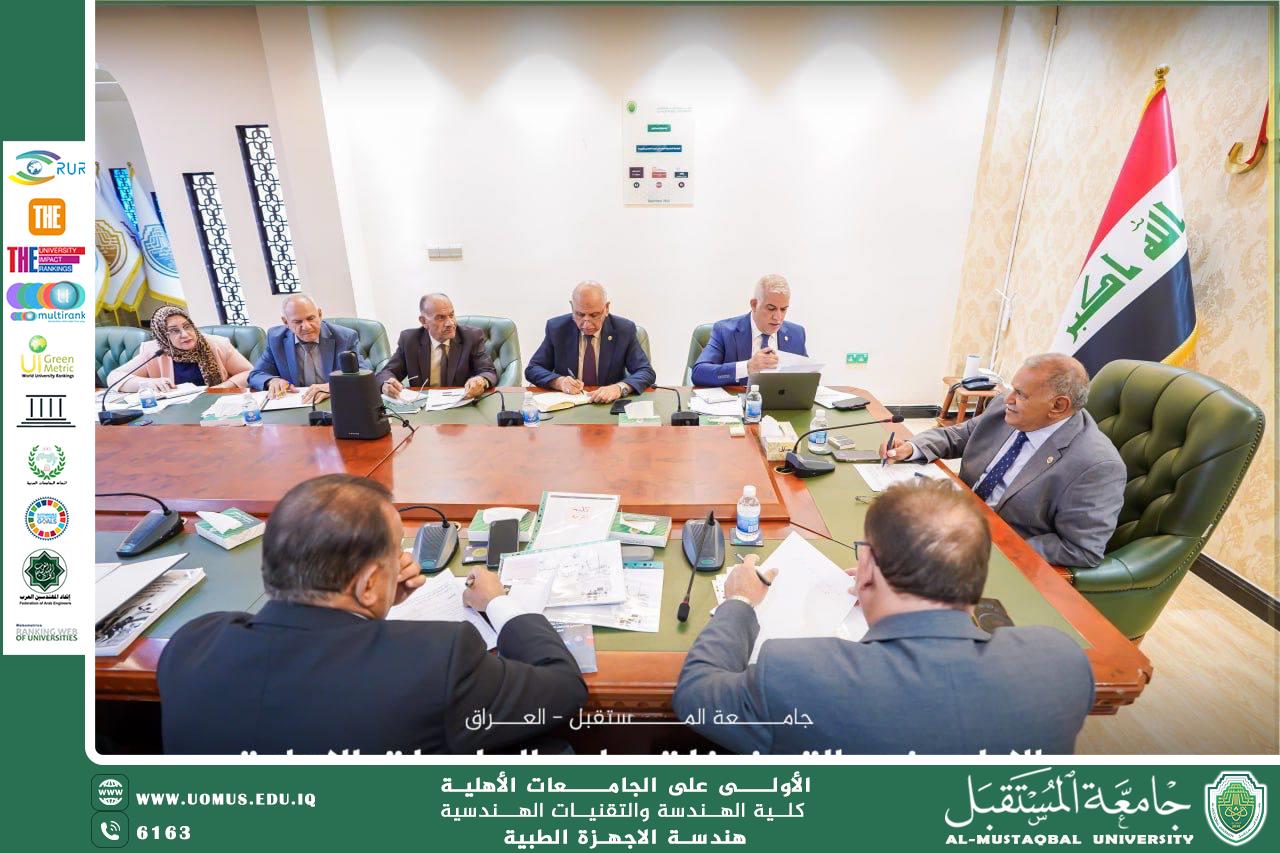 ترأس الاجتماع السيد رئيس الجامعة الأستاذ الدكتور حسن شاكر مجدي، بحضور السيد المساعد الإداري الأستاذ الدكتور منذر فاضل، ومدير الإشراف العلمي والأكاديمي الأستاذ مظفر صادق الزهيري، وعدد من الأساتذة والمسؤولين المعنيين.