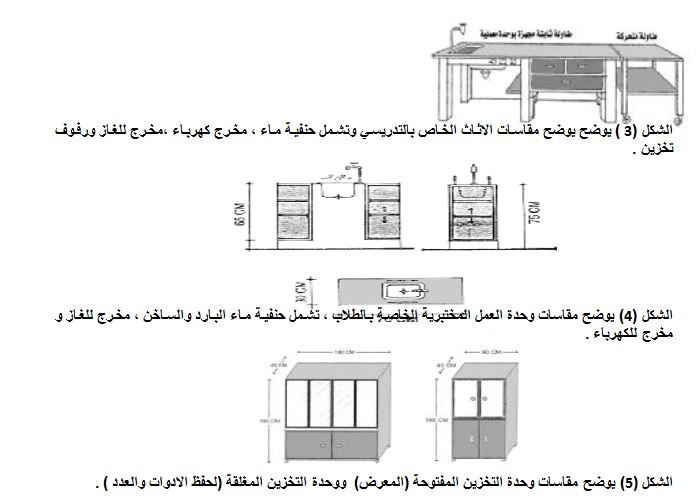 أ- الاثاث المختبري الثابت : طريقة توزيع وترتيب الاثاث الداخلي تتم حسب استخدام تجهيزات الاثاث الثابت داخل المختبرات العلمية , كما في الشكل (3)ادناه