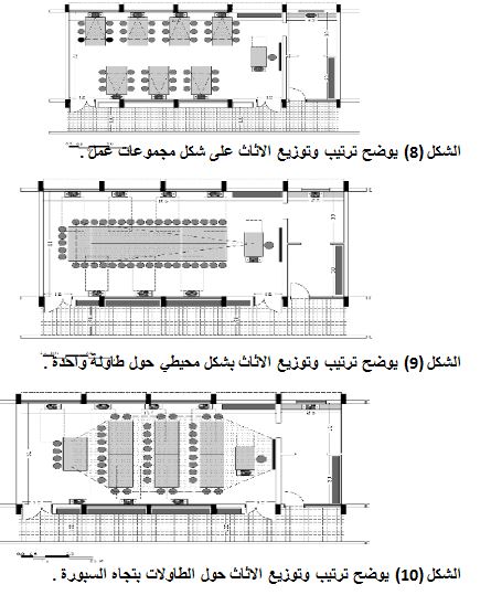 ترتيب وتوزيع الاثاث على شكل مجموعات عمل تسمح للطلاب بأعداد التجارب بأنفسهم تحت اشراف التدريسي , كما موضح بالشكل (8) ادناه .