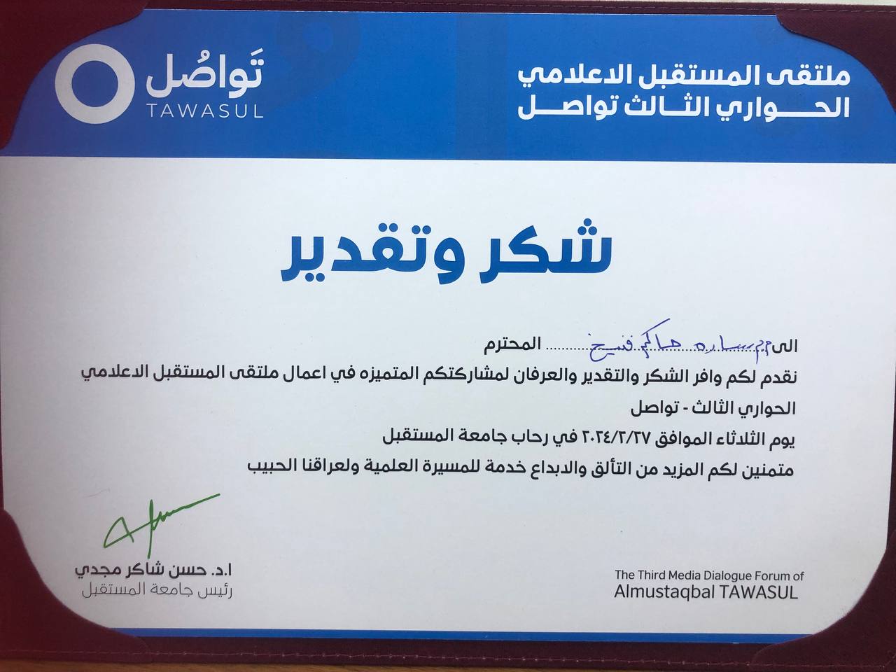 حصلت الست ساره حاكم فنيخ التدريسية في قسم الاعلام /كلية الاداب والعلوم الانسانية على كتاب شكر وتقدير لمشاركتها المتميزة في اعمال ملتقى المستقبل الاعلامي الحواري الثالث الذي اقيم في رحاب جامعة المستقبل وذلك يوم الثلاثاء الموافق 27/2/2024 يذكر ان الست ساره كانت رئيسة لجنة الاستقبال في الملتقى