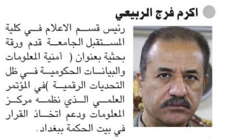 نشر رئيس قسم الإعلام بجامعة المستقبل الأستاذ الدكتور أكرم فرج عبد الحسين الربيعي ورقته البحثية الموسومة "أمنية المعلومات والبيانات الحكومية في ظل التحديات الرقمية" في مؤتمر العراق وتوازن المصالح الذي نظمه مركز المعلومات ودعم اتخاذ القرار في بيت الحكمة.