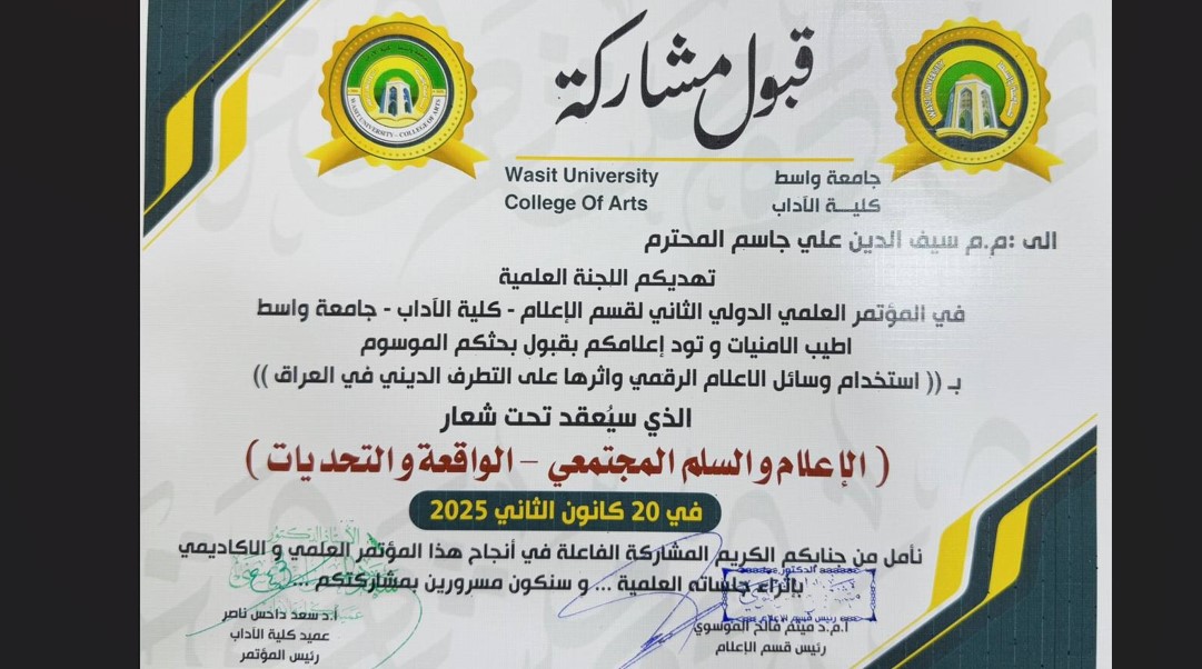 شارك التدريسي في قسم الاعلام كلية الاداب جامعة المستقبل سيف الدين الشمس في المؤتمر الدولي العلمي الثاني المقام في كنف جامعة واسط بعنوان (الاعلام والسلم المجتمعي - الواقع والتحديات)، ببحثه الموسوم (استخدام وسائل الاعلام الرقمي واثرها على التطرف الديني في العراق). وقد تمخضت مشاركته بكتاب شكر وتقدير من كلية الاداب جامعة واسط فضلا عن الاشادة لكل من رئيس قسم الاعلام د. اكرم الربيعي وعميد كلية الاداب د. حسين عزيز بما يقدمه التدريسي على الصعيد الاكاديمي والعلمي.