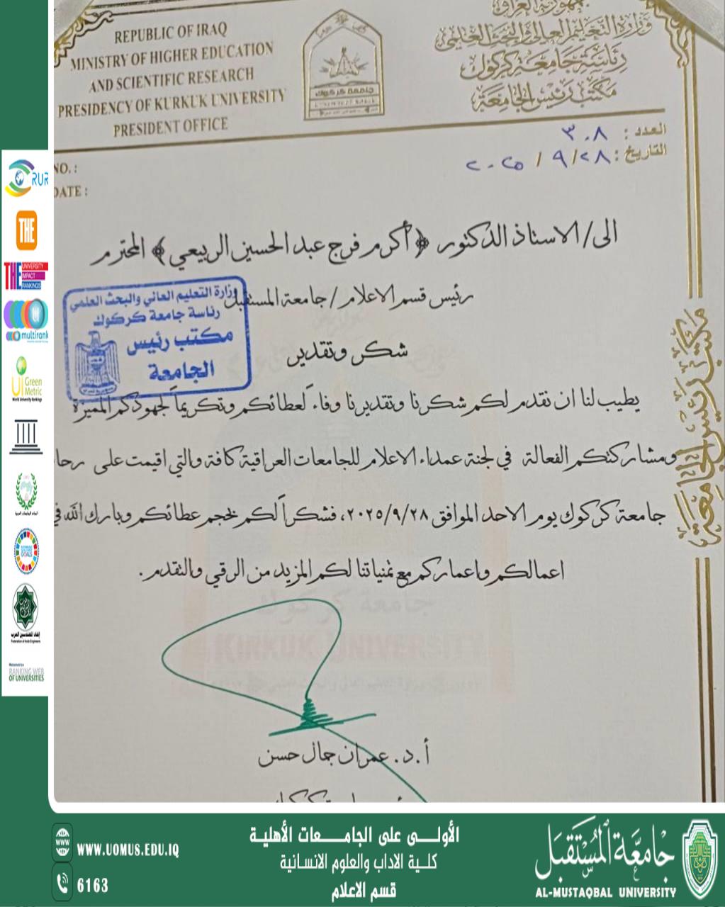 شاركت جامعة المستقبل، ممثلة بالأستاذ الدكتور أكرم فرج عبد الحسين الربيعي، رئيس قسم الإعلام في كلية الآداب والعلوم الإنسانية، بصفة ممثل عن كليات وأقسام الإعلام في الجامعات الأهلية، في الاجتماع الموسع للجنة عمداء الإعلام في العراق، والذي استضافته جامعة كركوك.