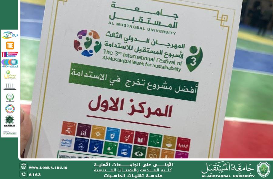 وجاء هذا التكريم تقديرًا للجهود العلمية والبحثية المتميزة التي بذلتها التدريسية في مشروعها، والذي يمثل نموذجًا للابتكار والإبداع في تطوير حلول مستدامة تسهم في دعم البيئة والمجتمع. ويعكس هذا الإنجاز التزام جامعة المستقبل بتعزيز روح البحث العلمي وتشجيع المشاريع التي تصب في خدمة التنمية المستدامة في العراق.