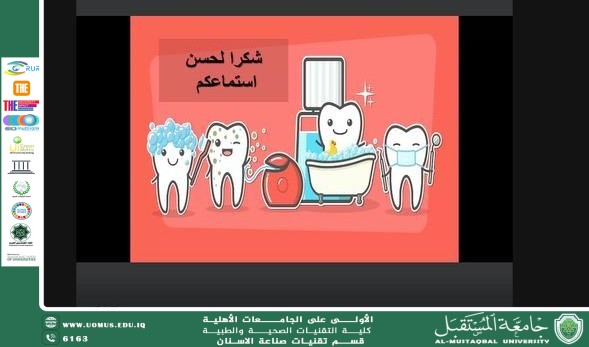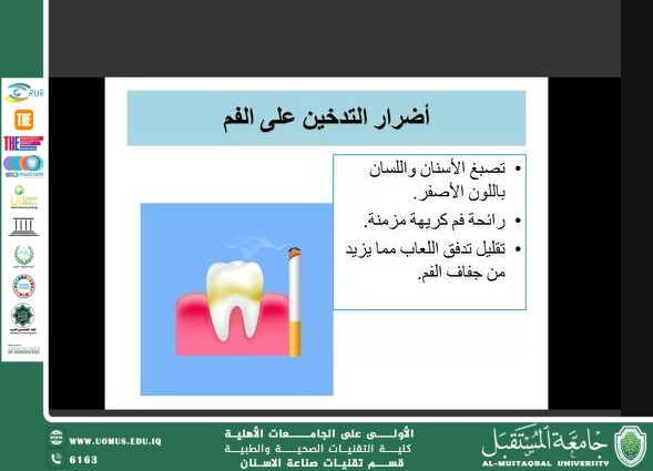سيقيم قسم تقنيات صناعة الاسنان ورشة الكترونيه وتحت عنوان (( تأثير التدخين على صحة الفم ))اليوم الثلاثاء الموافق 16/9/2025في تمام الساعة 8:00 مساءاً