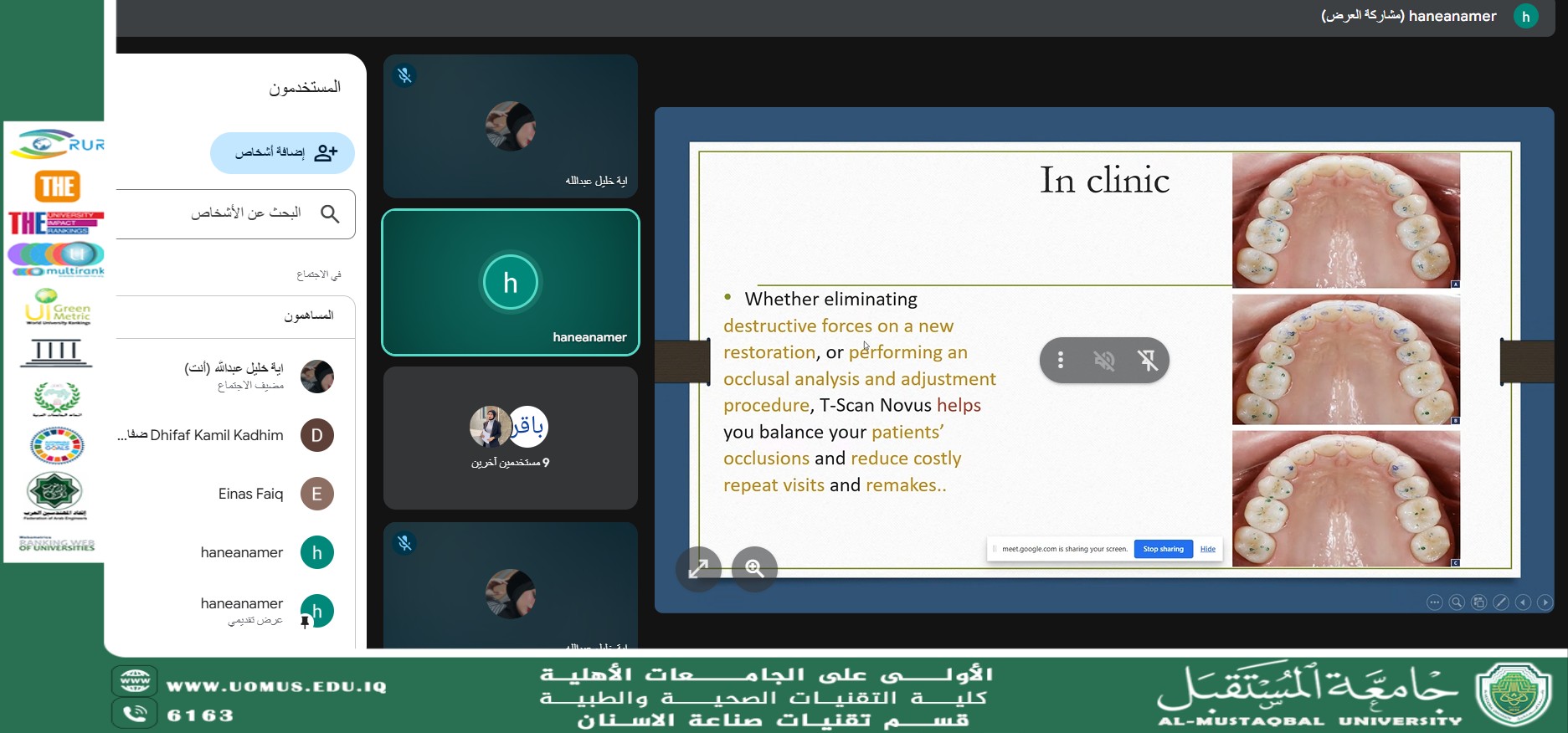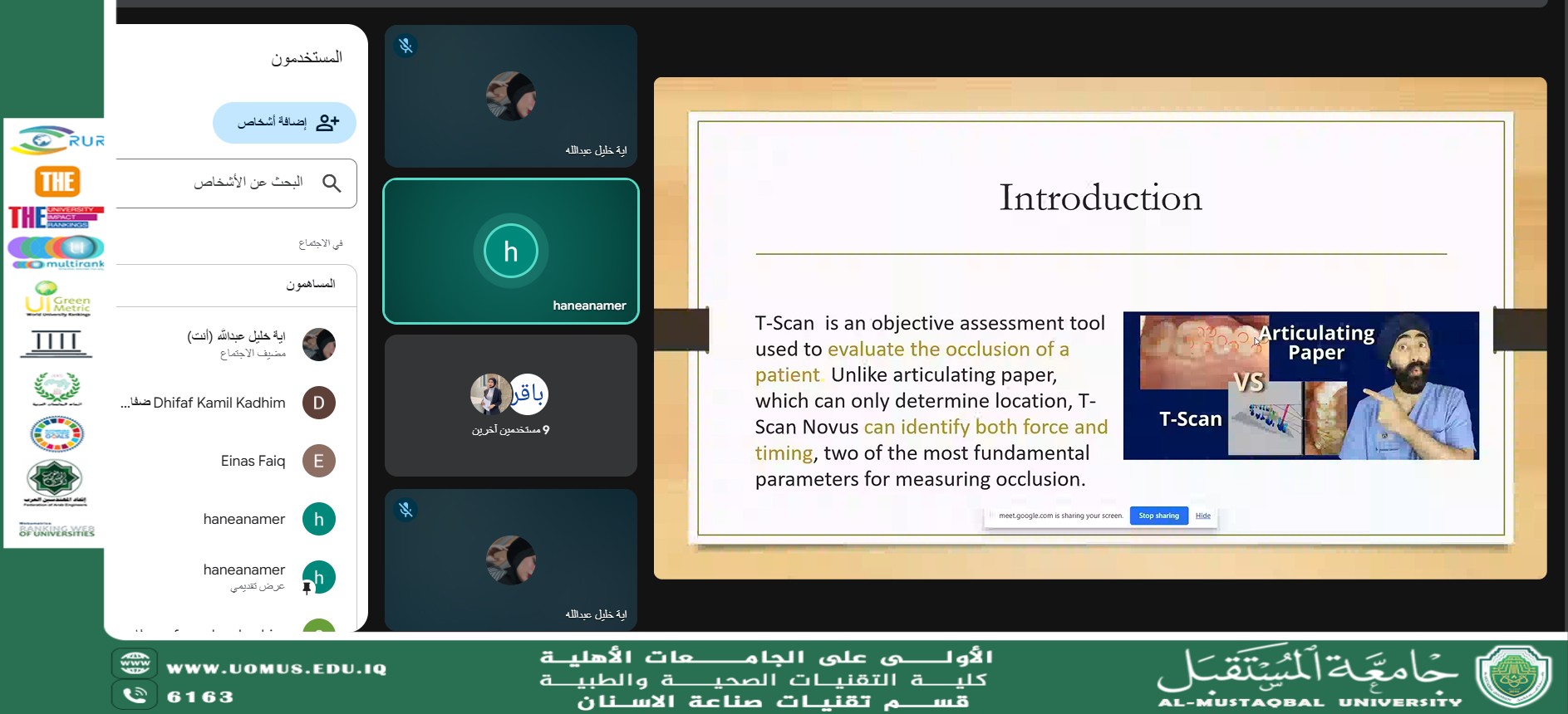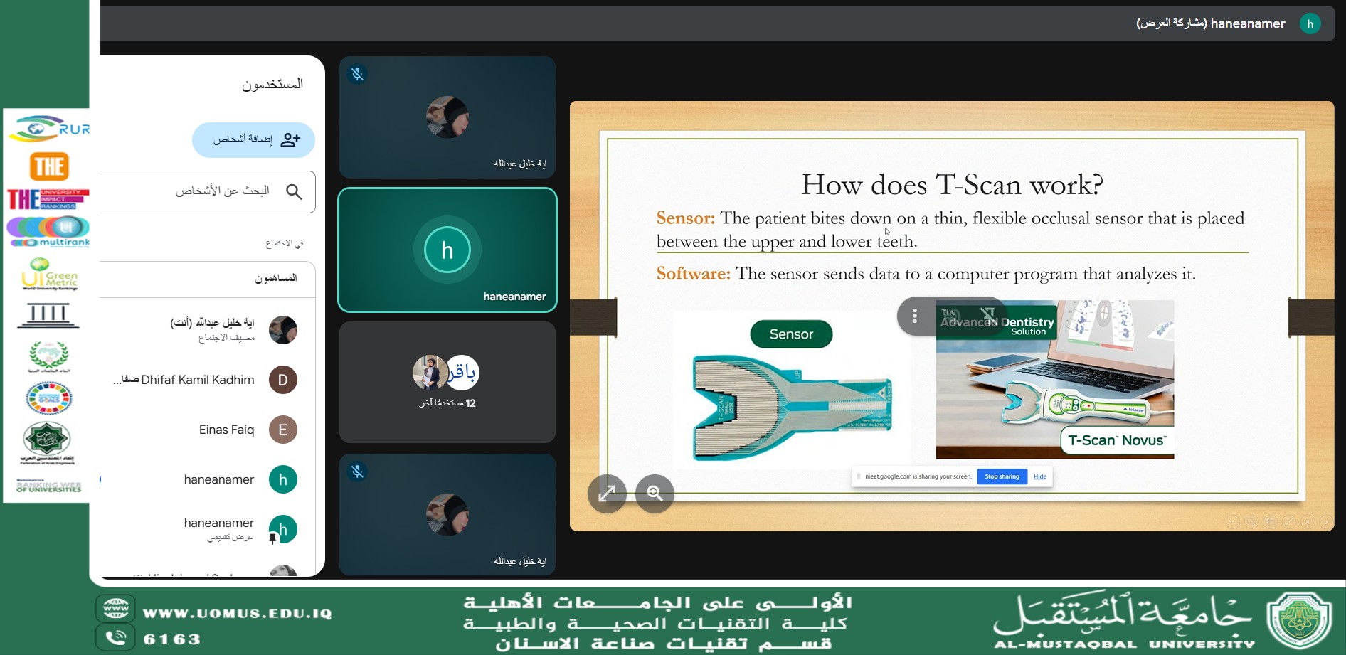 تحقيقا للهدف الثالث من اهداف التنمية المستدامة وهو الصحة الجيدة والرفاه قام قسم تقنيات صناعة الاسنان وتحت اشراف السيدة (( د. حنين عامر نعمة )) بعمل ورشة الكترونية تحت عنوان (( T SCAN)) وذلك يوم الثلاثاء الموافق 23/9/2025