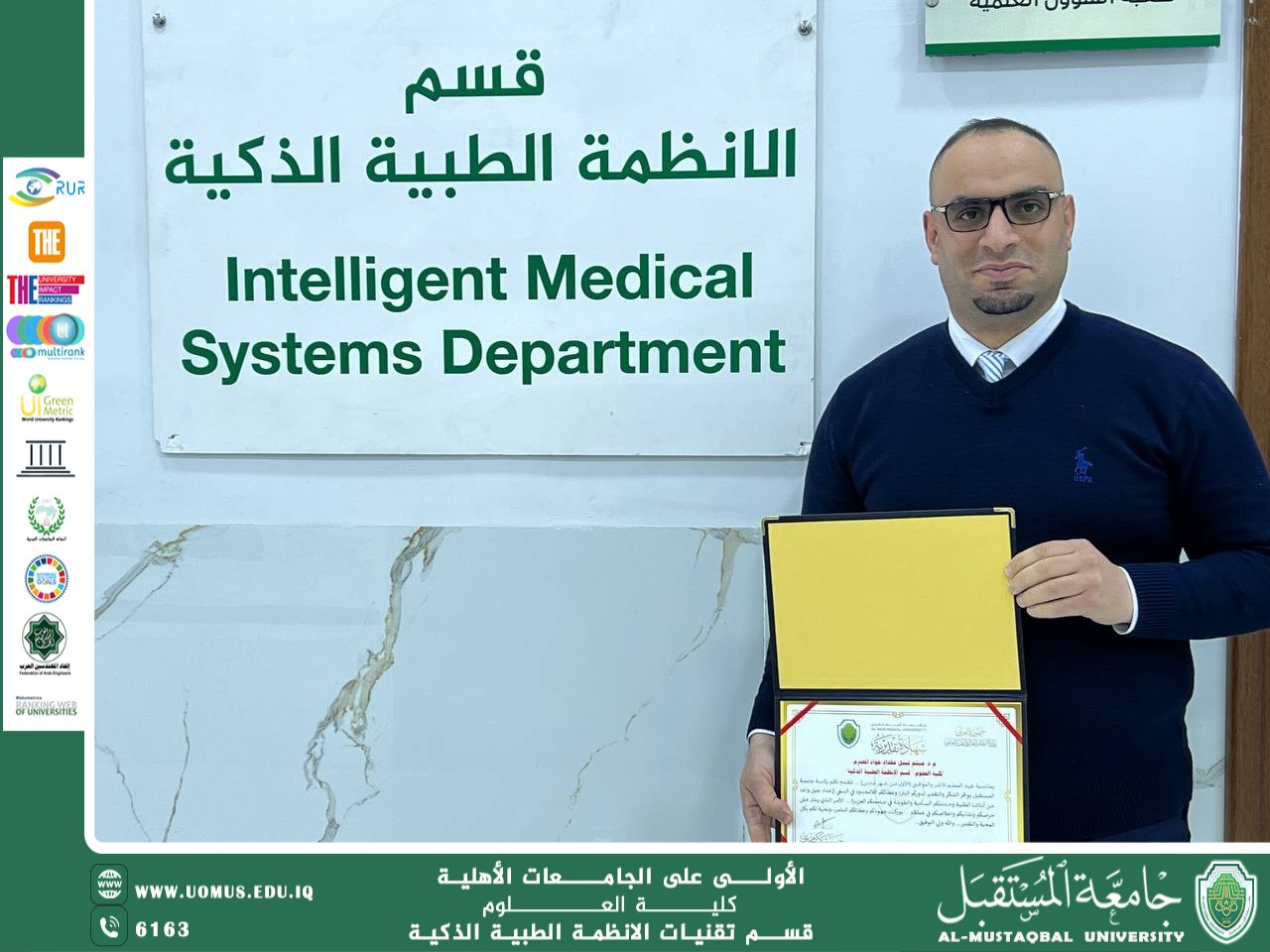 حصل مقرر قسم الأنظمة الطبية الذكية/كلية العلوم، المساعد الدكتور ميثم نبيل مقداد، على شهادة تقديرية بمناسبة عيد المعلم الأغر، وذلك تكريمًا لجهوده المتواصلة وعطائه العلمي المتميز في جامعة المستقبل على مدار 14 عامًا.