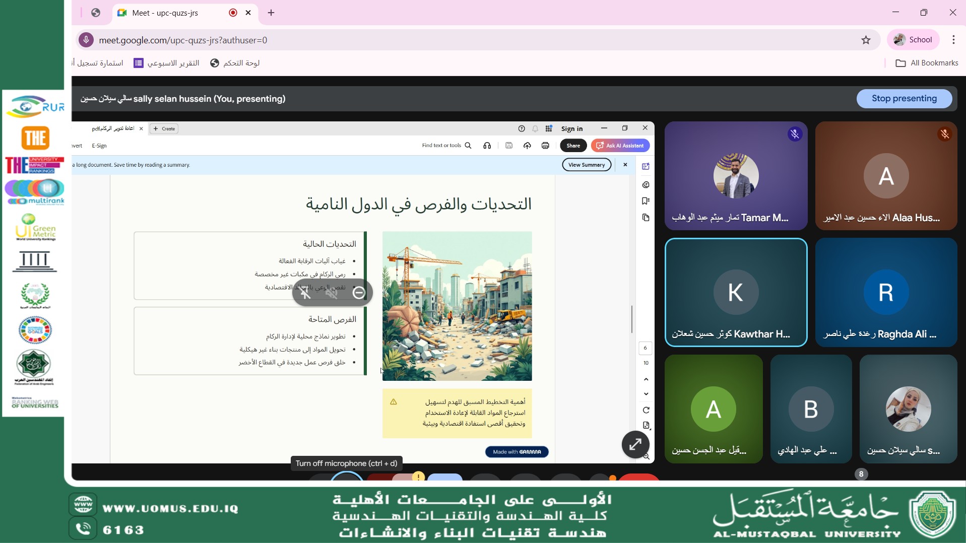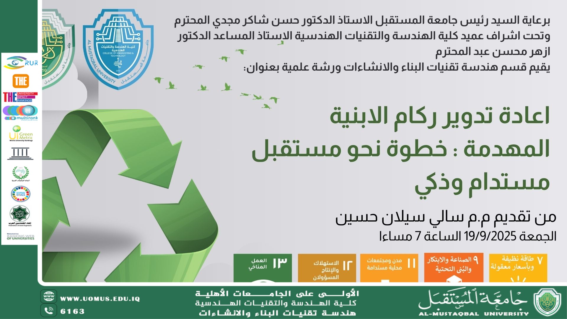 قدمت الورشة التدريسية م.م. سالي سيلان حسين، التي تناولت خلالها أهمية إعادة تدوير الركام الناتج عن الأبنية المهدمة، ودوره في تعزيز أهداف التنمية المستدامة، خصوصًا في تقليل النفايات الإنشائية والحفاظ على الموارد الطبيعية. كما سلطت الضوء على الأبعاد البيئية المتمثلة في تقليل التلوث والانبعاثات، إلى جانب الآثار الاقتصادية المتمثلة في خفض كلف البناء وتشجيع الاستثمار في التقنيات الحديثة لإعادة التدوير.