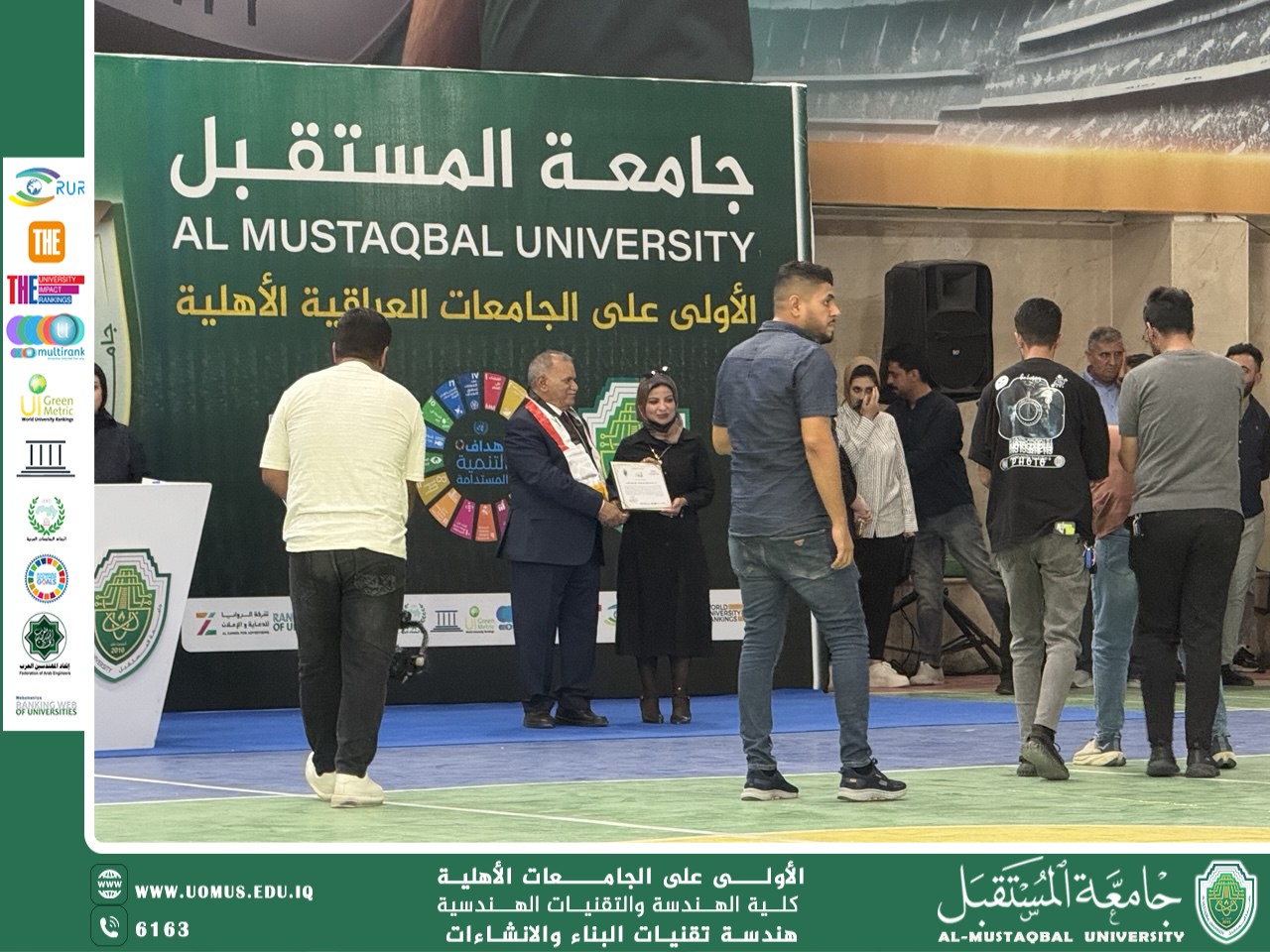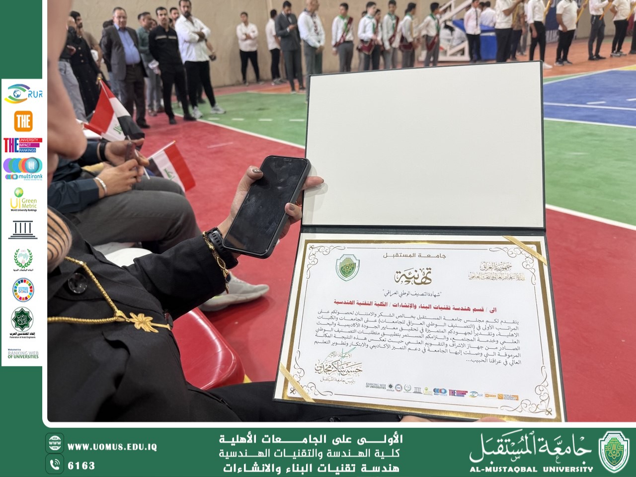 ضمن احتفالية اليوم الوطني العراقي وفعاليات معسكر الاستدامة، تم تكريم قسم هندسة تقنيات البناء والإنشاءات في كلية الهندسة والتقنيات الهندسية، وذلك لحصوله على المركز الأول في التصنيف الوطني العراقي للجامعات والكليات التقنية والهندسية.