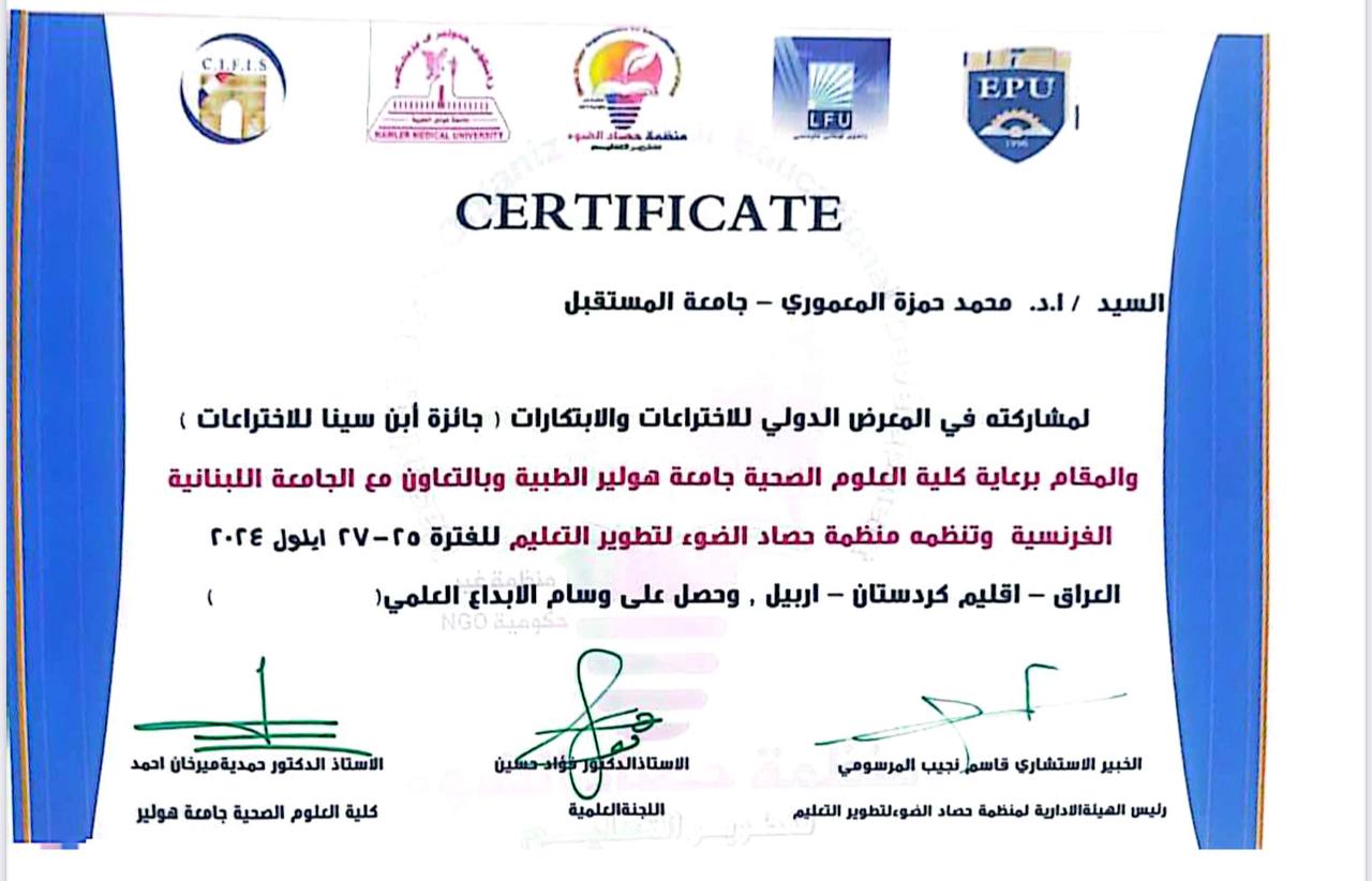 قدم وفد جامعة المستقبل ثلاث براءات اختراع في المعرض، والتي تم الحصول على وسام الابداع العلمي للمشاركين . كما أدار المؤتمر الأستاذ المتمرس الدكتور محمد حمزة المعموري، ممثلاً عن جامعة المستقبل، مما يعكس دور الجامعة الفعال في مثل هذه الفعاليات. يعتبر هذا المعرض فرصة لعرض وإبراز الإبداع والابتكار في مجالات الهندسة والتكنولوجيا في العراق، فضلاً عن تعزيز التبادل المعرفي والتعاون بين الجامعات والمؤسسات العلمية،