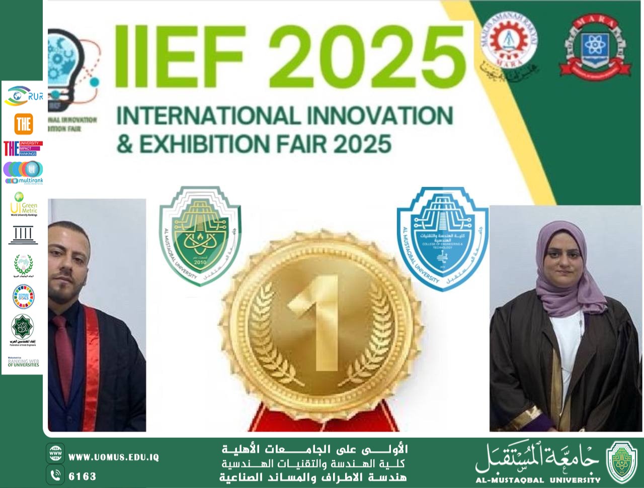 حصد م.م.منتظر صالح مهدي التدريسي بقسم هندسة الاطراف و المساند الصناعية في كلية الهندسة و التقنيات الهندسية /جامعة المستقبل على المراكز الأولى في المسابقة الدولية للابتكار المقامة في ماليزيا . حيث شارك الباحث بالبحث الموسوم