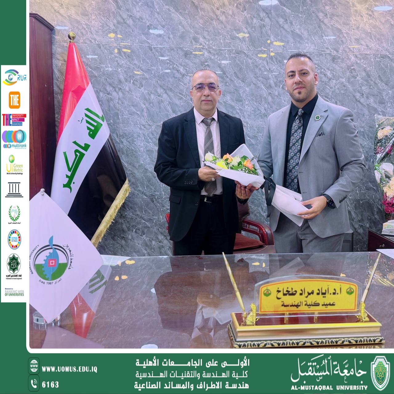 تلقى م.م. منتظر صالح مهدي، التدريسي في قسم هندسة الأطراف والمساند الصناعية بكلية الهندسة والتقنيات الهندسية في جامعة المستقبل، تكريمًا رفيعًا من السيد رئيس جامعة النهرين الأستاذ الدكتور علي عبد العزيز الشاوي و السيد عميد كلية الهندسة بجامعة النهرين الأستاذ الدكتور أياد مراد طخاخ، وذلك تقديرًا لفوزه بالمراكز الأولى في مسابقة علمية عالمية، حيث تم منحه الميدالية الذهبية تكريماً لإنجازه العلمي المتميز.