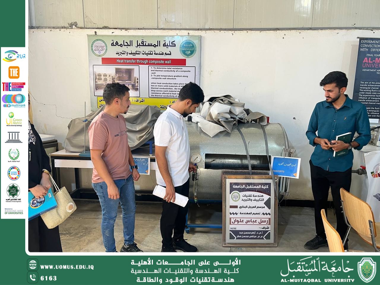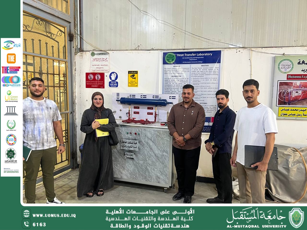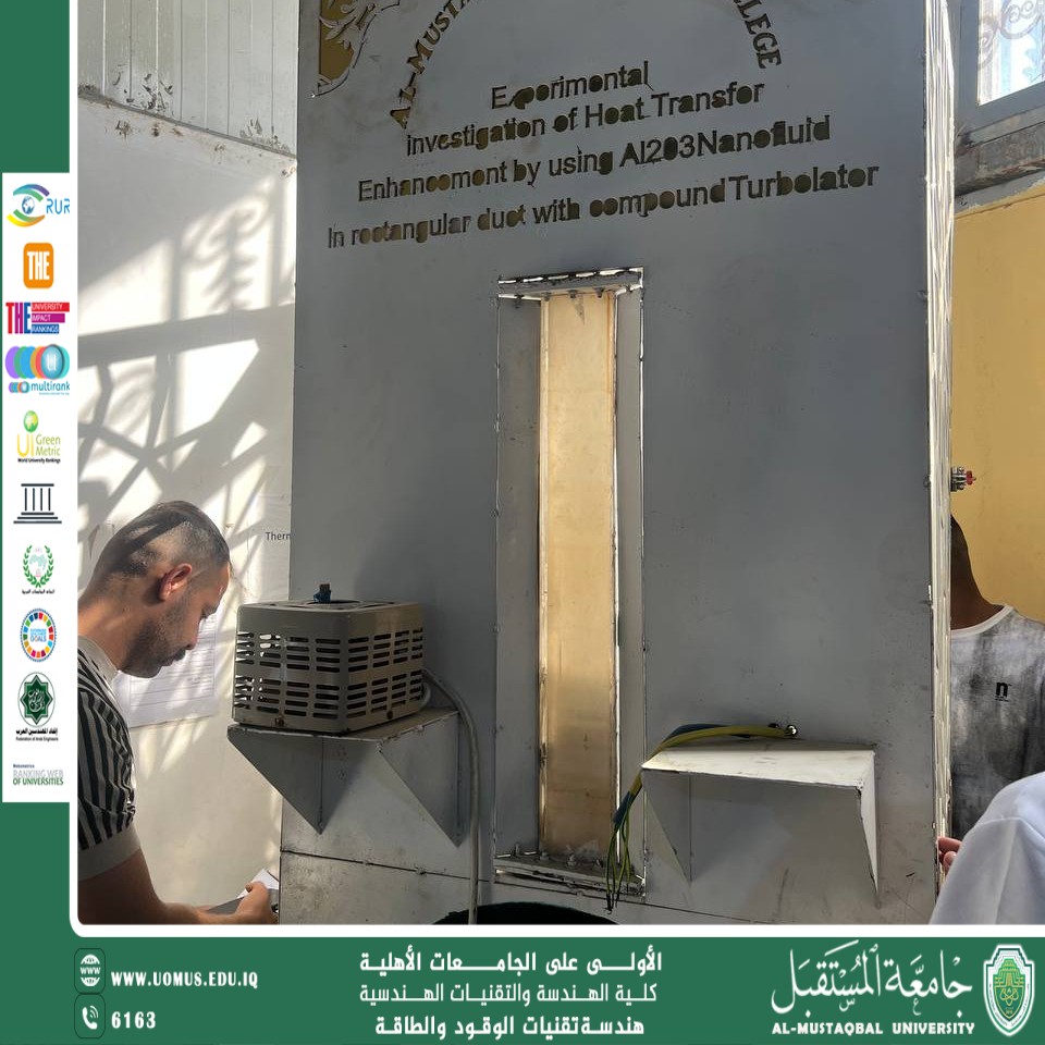 حضر طلبة المرحلة الثالثة في قسم هندسة تقنيات الوقود والطاقة – كلية التقنيات الهندسية / جامعة المستقبل، محاضرة عملية في مختبر انتقال الحرارة، ضمن الجدول الأسبوعي للمادة، والتي تضمنت تطبيقات وتجارب تهدف إلى توضيح المفاهيم الأساسية للمادة بطريقة عملية وتفاعلية.