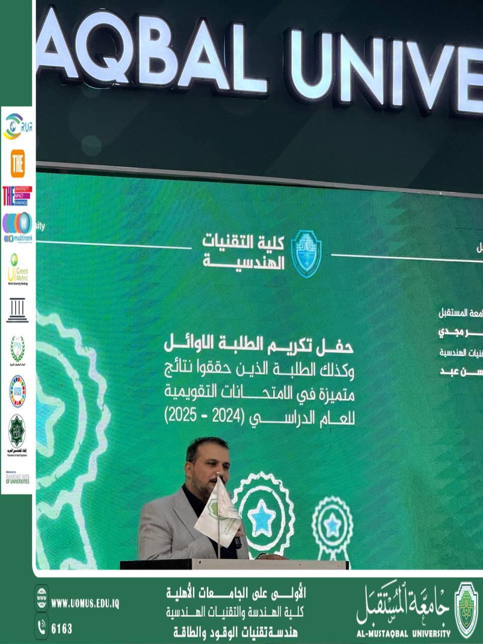 ألقى الأستاذ زمن علي، رئيس نقابة المهندسين، كلمة خلال حفل تكريم الطلبة، أعرب فيها عن سعادته بالمستوى المتقدم الذي وصل إليه طلبة كلية التقنيات الهندسية في جامعة المستقبل، مشيدًا بجودة المشاريع المقدّمة وروح الإبداع التي تميز بها الطلبة الخريجون.