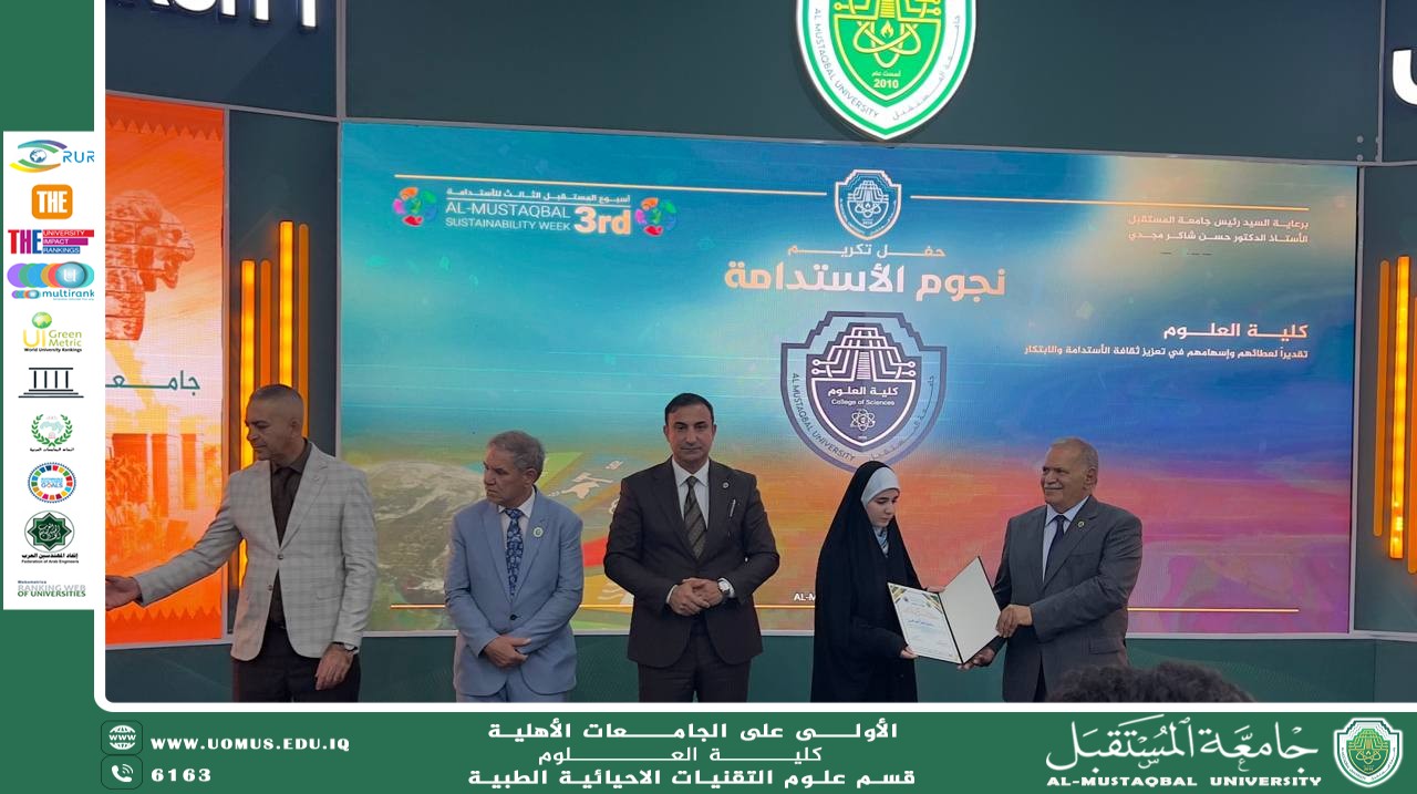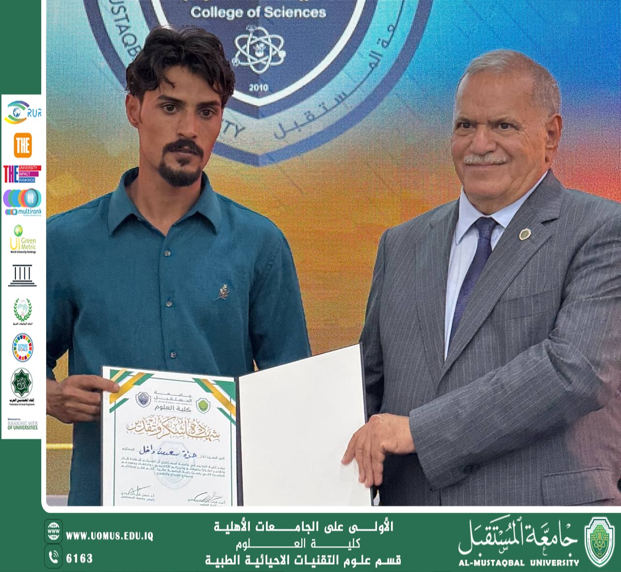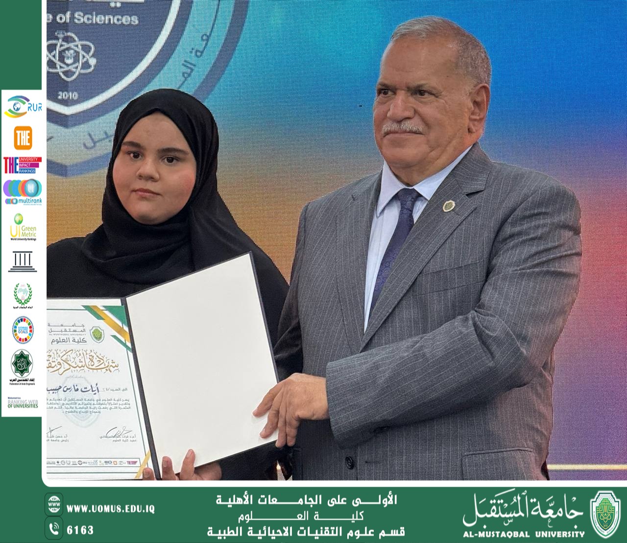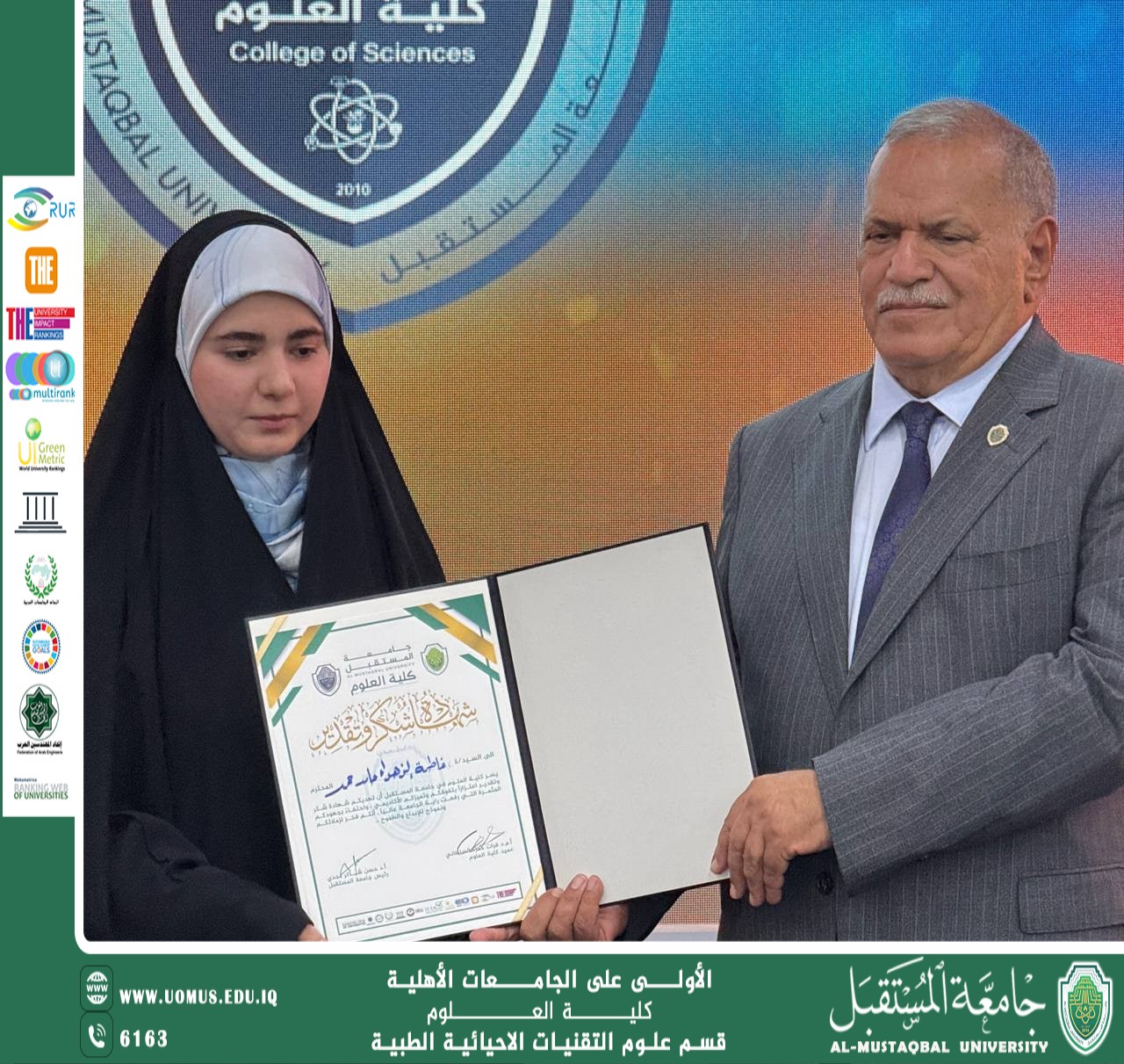 برعاية كريمة من السيد رئيس جامعة المستقبل، أقامت كلية العلوم حفلًا خاصًا لتكريم الطلبة الأوائل في قسم التقنيات الأحيائية الطبية، بحضور السيد عميد الكلية الدكتور فرات حمزة السلطاني، وعدد من رؤساء الأقسام، وأعضاء الهيئة التدريسية، وذوي الطلبة.