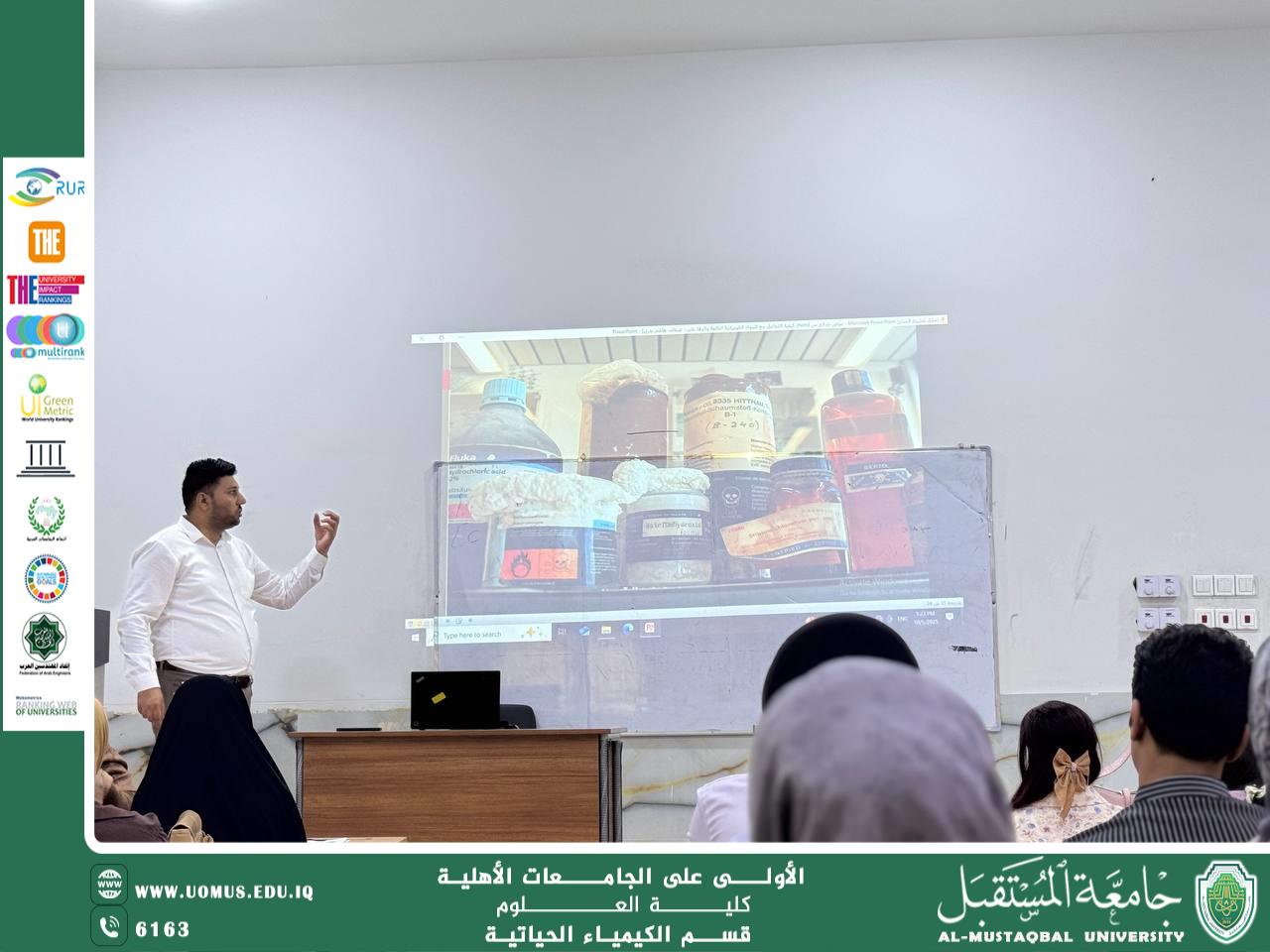 أقام قسم الكيمياء الحياتية في جامعة المستقبل ورشة علمية للتدريسي الدكتور كرار مجيد عبيد حول التعامل الآمن مع المواد الكيميائية التالفة، بحضور أعضاء الهيئة التدريسية والطلبة.