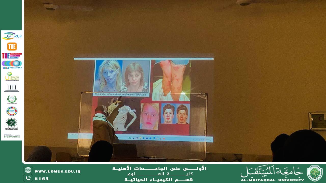 نظمت كلية العلوم / قسم الكيمياء الحياتية في جامعة المستقبل ورشة توعوية بعنوان "تأثير مادة الميثامفيتامين (Crystal Ice) على الفرد والمجتمع"، قدمتها التدريسية م.د. داليا شاكر عبيدة، بهدف توعية الطلبة بمخاطر تعاطي المواد المخدرة، ولا سيما مادة الكريستال آيس التي تُعد من أخطر أنواع المخدرات المنتشرة حالياً في العراق.