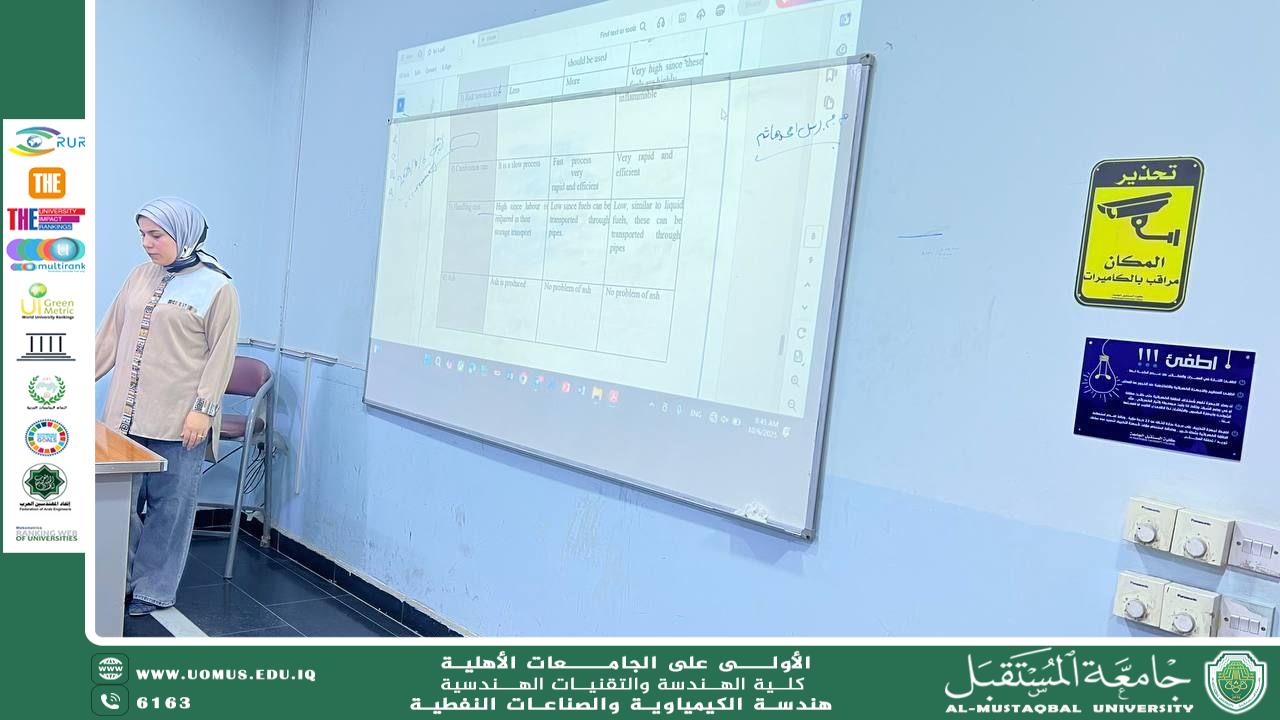 -محاضرة مادة تكنولوجيا الوقود للمرحلة الثانية، ألقتها المدرس المساعد رسل أحمد هاشم، وركزت على موضوع الوقود وخصائصه وطرق إنتاجه.