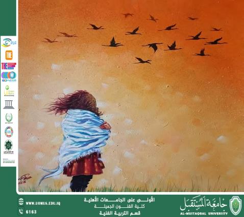 تتكون اللوحة من مجموعة طيور محلقة في الفضاء ويناظرها شكل بصري ، وكلاهما يخلقان حالة من التوازن الفني بين عالم روحي - الطيور،وعالم دنيوي -الشكل البصري. يمنح الفنان اللوحة حركة دراماتيكية تتوزع بين الطيور وما يرتدية الشكل البصري من الشال الأزرق الذي تعبر طياته عن تموجات تبعث الاحساس العاطفي ،فضلا عن خلق حالة من التضاد اللوني ما بين الاحمر والاسود؛والبرتقالي والاسود:ما بين الطاقة الايجابية-القوة العاطفية،والطاقة السلبية،هذا التباين البصري يرسل إشارات بصرية تشدة من انتباة المتلقي.يعبر الفضاء البرتقالي عن الاحساس الروحي والحيوي ،والذي يماثل روحانية طير اللقلق الذي يعبر عن الامل والتغيير،والتفاؤل الذي حضيت به الطيور من خلال العودة إلى موطنها بعد إنتهاء الهجرة ، عمل الفنان على خلق احساس مقارب ومتجانس مع ما يوحي به الشكل البصري وهو في لحظة انتظار ما كان يتأمل عودته . يرمي الفنان من وراء التفاتة الشكل البصري الى خلق حوار روحي مع مكونات الفضاء، فضلا عن اثارة ذكريات الماضي للشكل البصري ومعايشة تأملات الحاضر،وخلق جو انفعالي اكثر تأثير على رؤية المتلقي،وكذلك منح الرؤية البصرية طابع الانحدار نحو عمق اللوحة الفنية ، وخلق تأملات فكرية ،والانفتاح على شفرة العمل الفني وفك ازراره، و الحصول على قراءات متعددة وفقا لما يراه. يمنح الفنان الفضاء لون برتقالي كي يتوافق مع الوان الغروب حيث عودة الارواح الى طبيعتها- عودة الطيور والغائب- لمكانهم. تعبر اللوحة عن التناغم الايقاعي الموسيقي بين حركات الطيور المتنوعة وضربات الفراشاة ذات الاحساس العاطفي والموسيقي. يعطي الفنان لوحته دلالات رومانسية تعبر عن مراجعة الذات، حيث الهدوء والتأمل.يعبر التدرج اللوني عن سيرورة زمنية ذات ابعاد عاطفية ورومانسية الدلالة؛فضلا عن حركة الانتشار الايقاعي اللوني على كل مكونات اللوحة.يجعل الفنان الشكل البصري يرسل خطابا الى الفضاء الروحي ، ويتخذ من عودة المهاجر صورة ايحائية للغائب والحاضر في رؤيته البصرية .يتخذ الفنان من الطيور معادلا موضوعيا لما هو يجول في خاطره وتتراءى له عودة المهاجر في صورة خيالية وبصرية.يرمز العشب الاخضر الى دلالة التأمل والتحول الزمني . تمكن الفنان من غزل المكان والزمان على سطح لوحته، والتحول من العقل الباطن الى الواقع المرئى ،ليسرح احاسيسه وايحاءاته امام مرآة حياته،لعلها تطفىء نار الوجد ،ويصبح الحلم حقيقة. وبالتالي اظهرت اللوحة الفنية للمتلقي صورة من التآلف الايقاعي الموسيقي مع الشكل والمضمون.