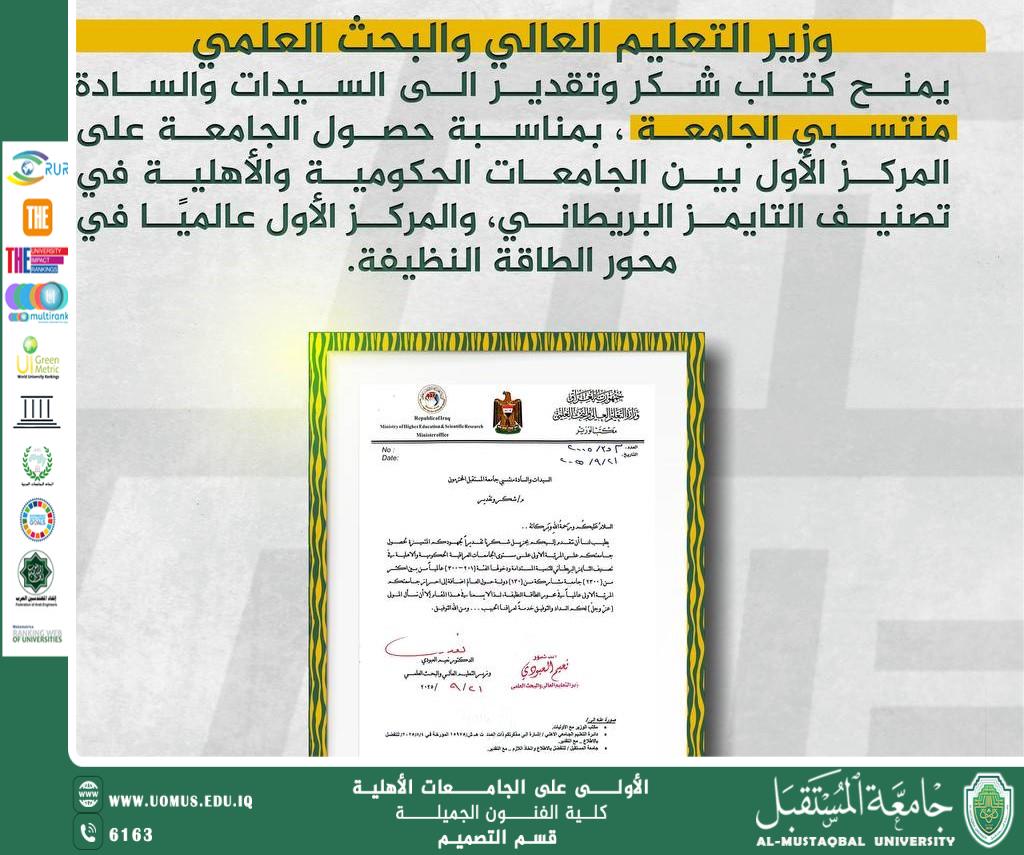 وجّه معالي وزير التعليم العالي والبحث العلمي الأستاذ الدكتور نعيم العبودي كتاب شكر وتقدير إلى الأستاذ الدكتور حسن شاكر مجدي، رئيس جامعة المستقبل، تثمينًا للجهود المتميزة التي أسفرت عن تحقيق الجامعة إنجازًا رائدًا بحصولها على المرتبة الأولى بين الجامعات العراقية الحكومية والأهلية في تصنيف التايمز البريطاني للتنمية المستدامة لعام 2025، ودخولها ضمن الفئة 201–300 عالميًا من بين أكثر من 2300 جامعة تمثل 130 دولة حول العالم. كما تميزت الجامعة بتحقيق إنجاز غير مسبوق على مستوى العالم، حيث احتلت المركز الأول عالميًا في محور الطاقة النظيفة.