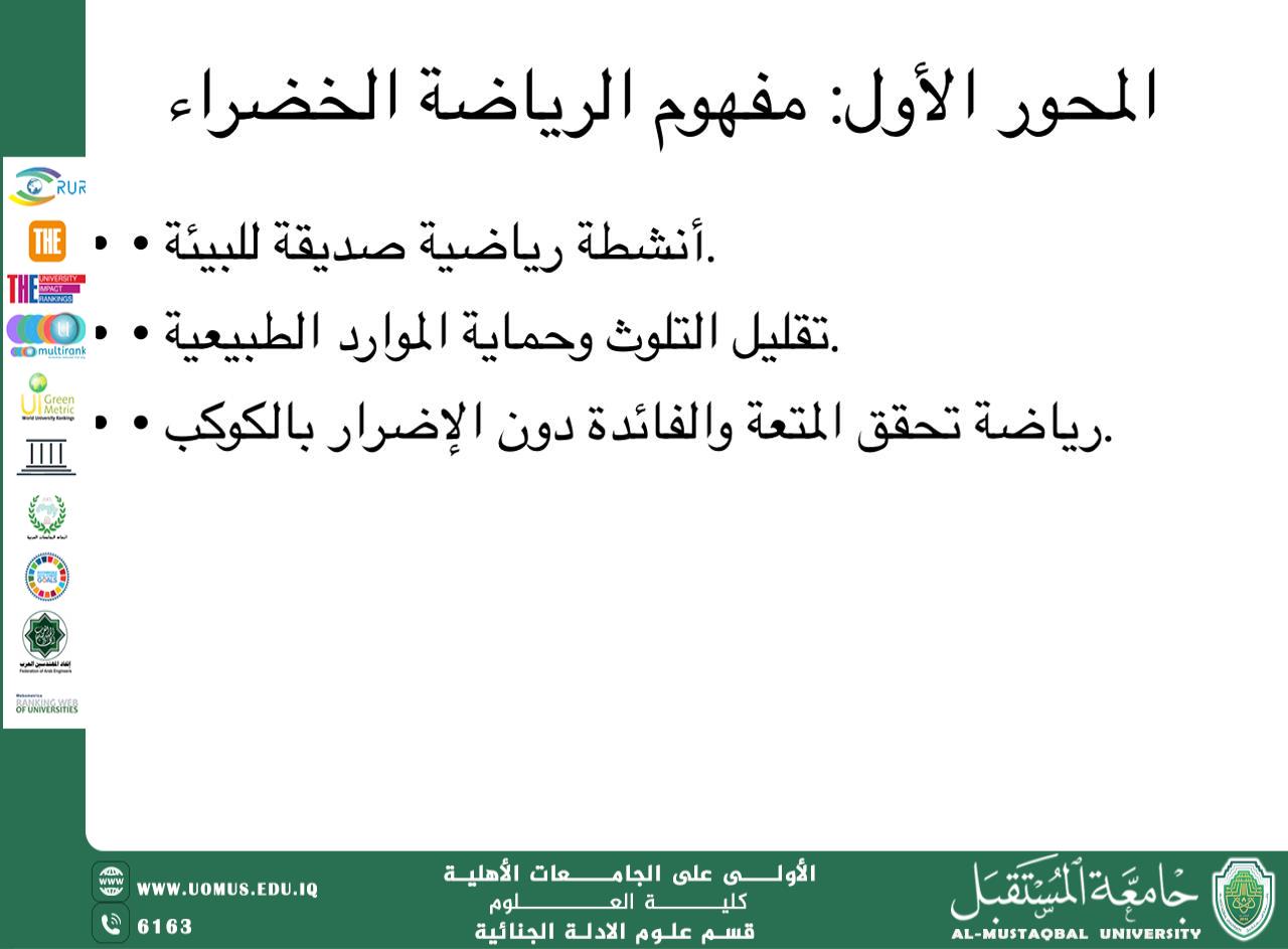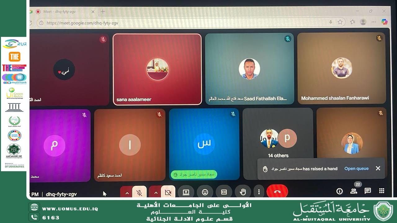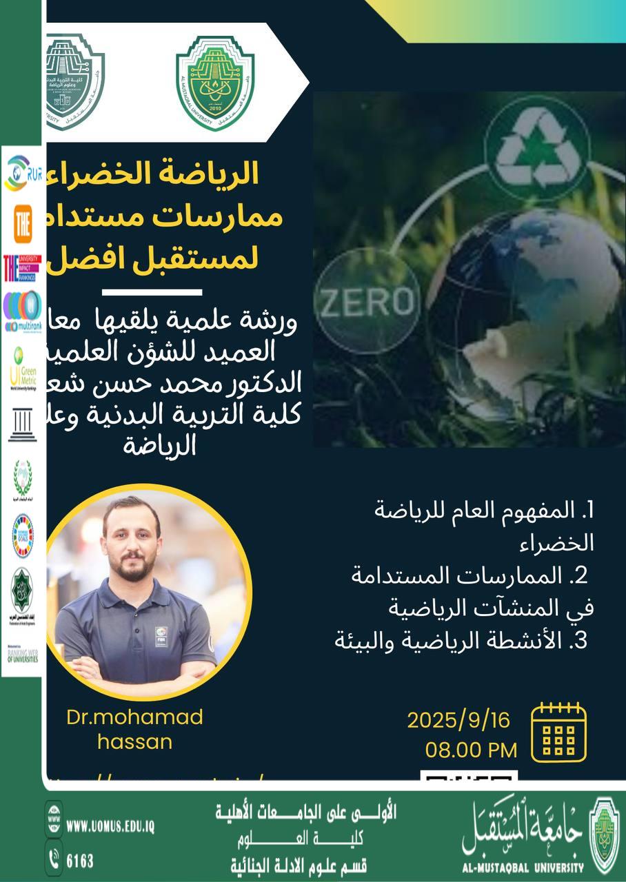 ضمن الاستعدادات لمعسكر سفراء الاستدامة، أقيمت ورشة علمية إلكترونية بعنوان "الرياضة الخضراء: ممارسات مستدامة لمستقبل أفضل"، بحضور ومشاركة منتسبي قسم الأدلة الجنائية في كلية العلوم – جامعة المستقبل.