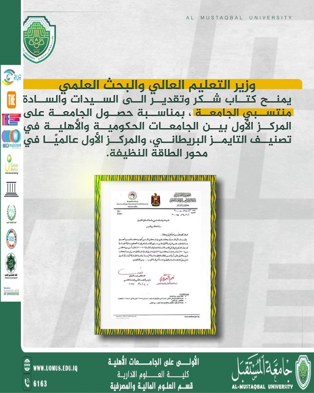 وأشاد معالي الوزير بجهود جميع منتسبي الجامعة، متمنيًا لهم دوام النجاح، فيما أكد رئيس الجامعة أن هذا التكريم يشكل دافعًا لتعزيز مكانة الجامعة والارتقاء بسمعة التعليم العالي العراقي عالميًا.