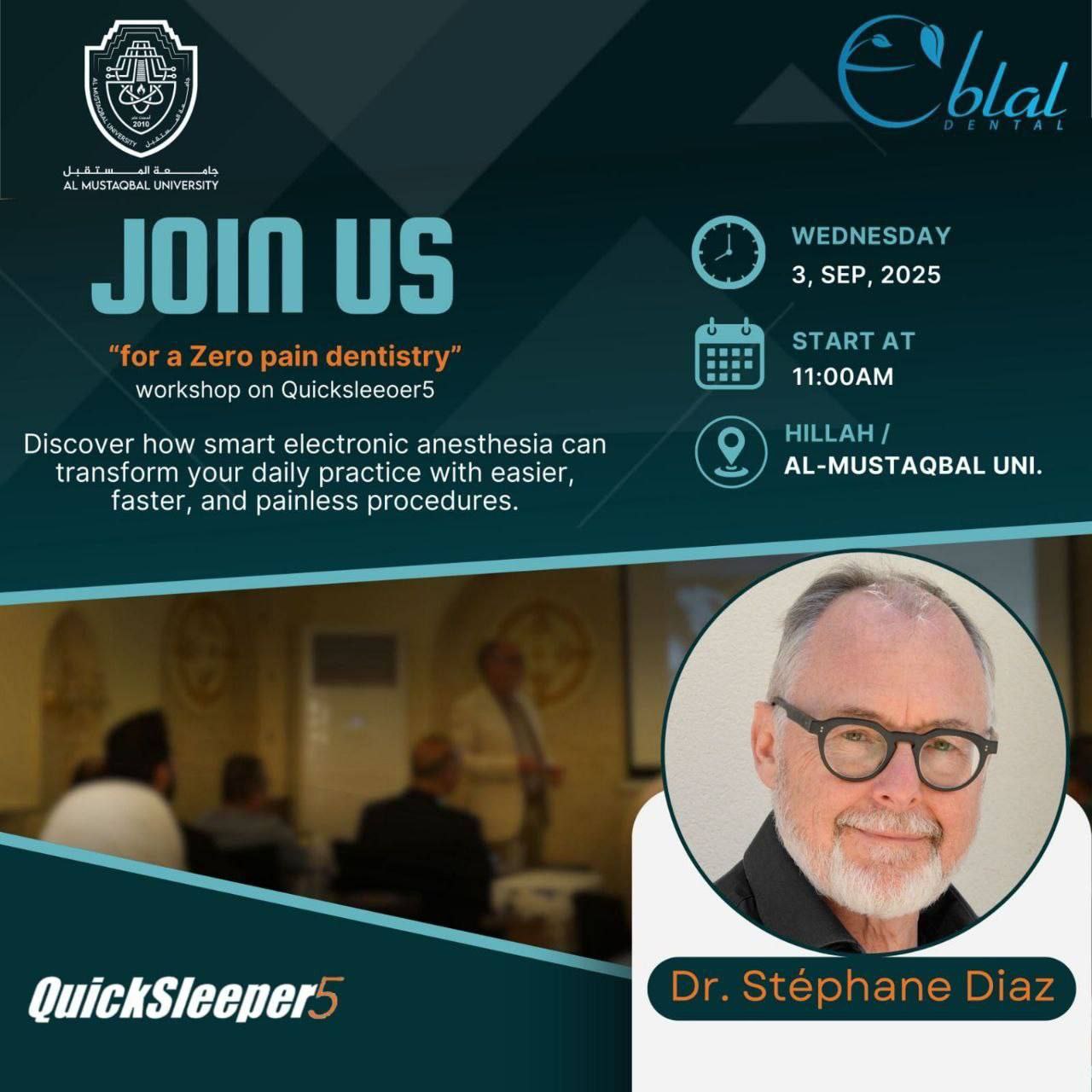 تتشرف جامعة المستقبل بالتعاون مع Eblal Dental بدعوتكم لحضور الورشة العلمية: "من أجل طب أسنان بلا ألم" حول جهاز QuickSleeper5 للتخدير الإلكتروني الذكي. 🗓️ الأربعاء 3 أيلول 2025 ⏰ الساعة 11:00 صباحًا 📍 جامعة المستقبل / الحلة 🔹 يقدمها: د. ستيفان دياز