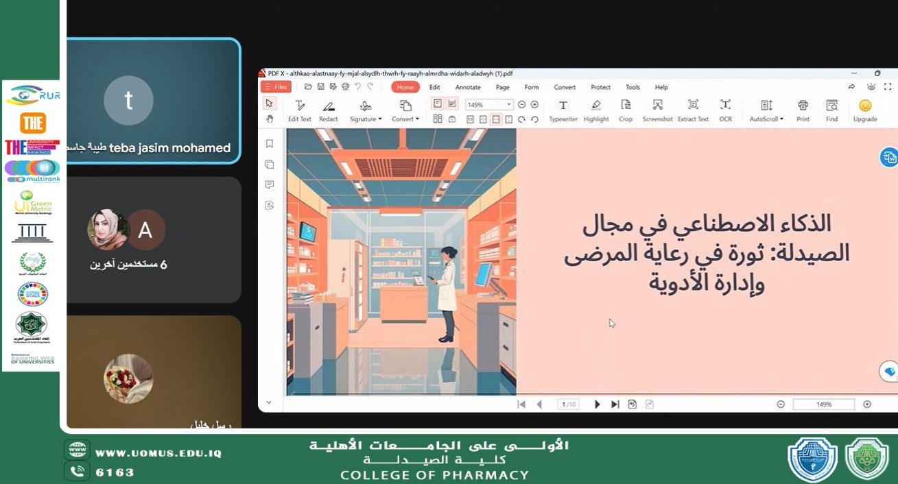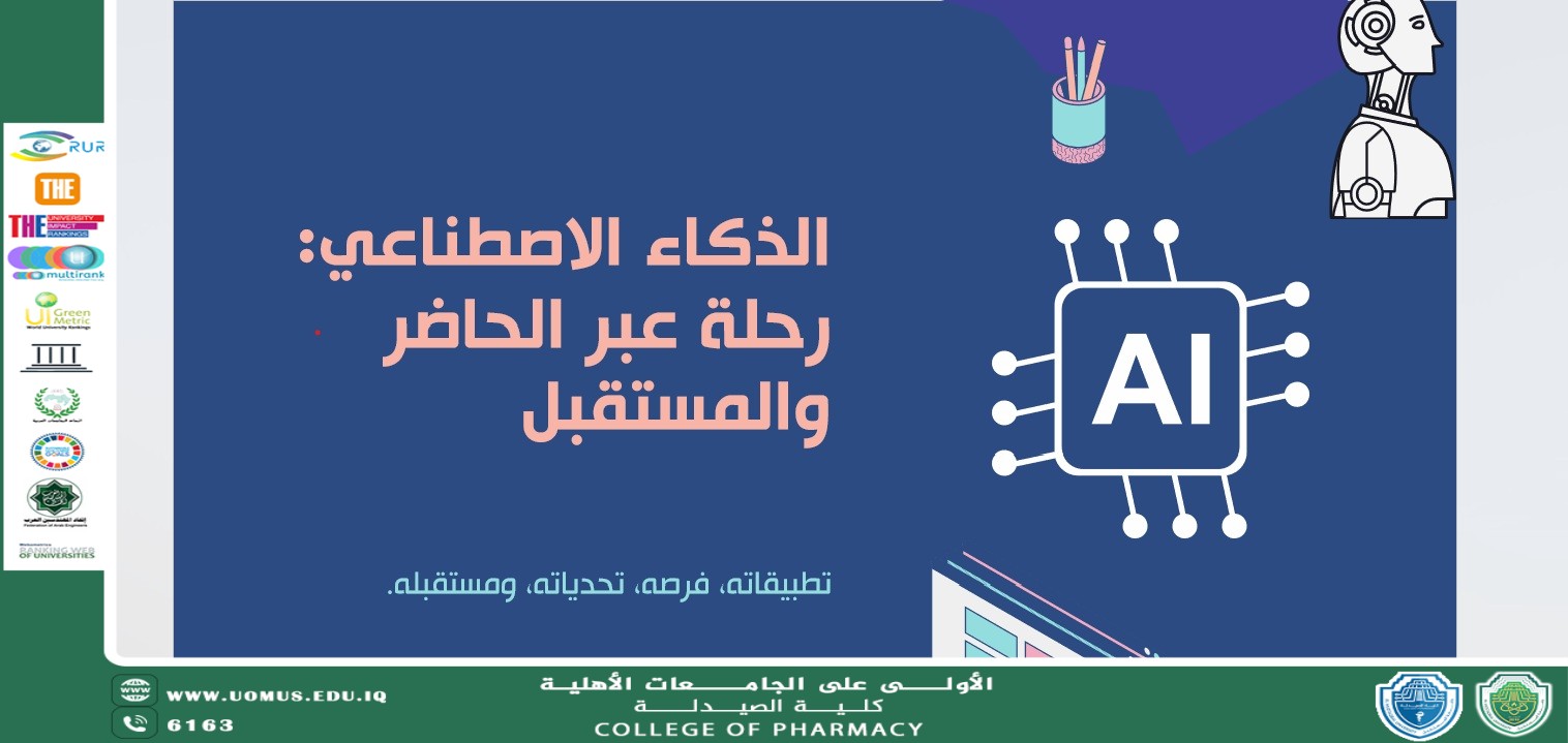 بأشراف عميد كلية الصيدلة الاستاذ الدكتور احمد خالد الظالمي ,اقيمت ورشة علمية بعنوان (تطبيقات الذكاء ...