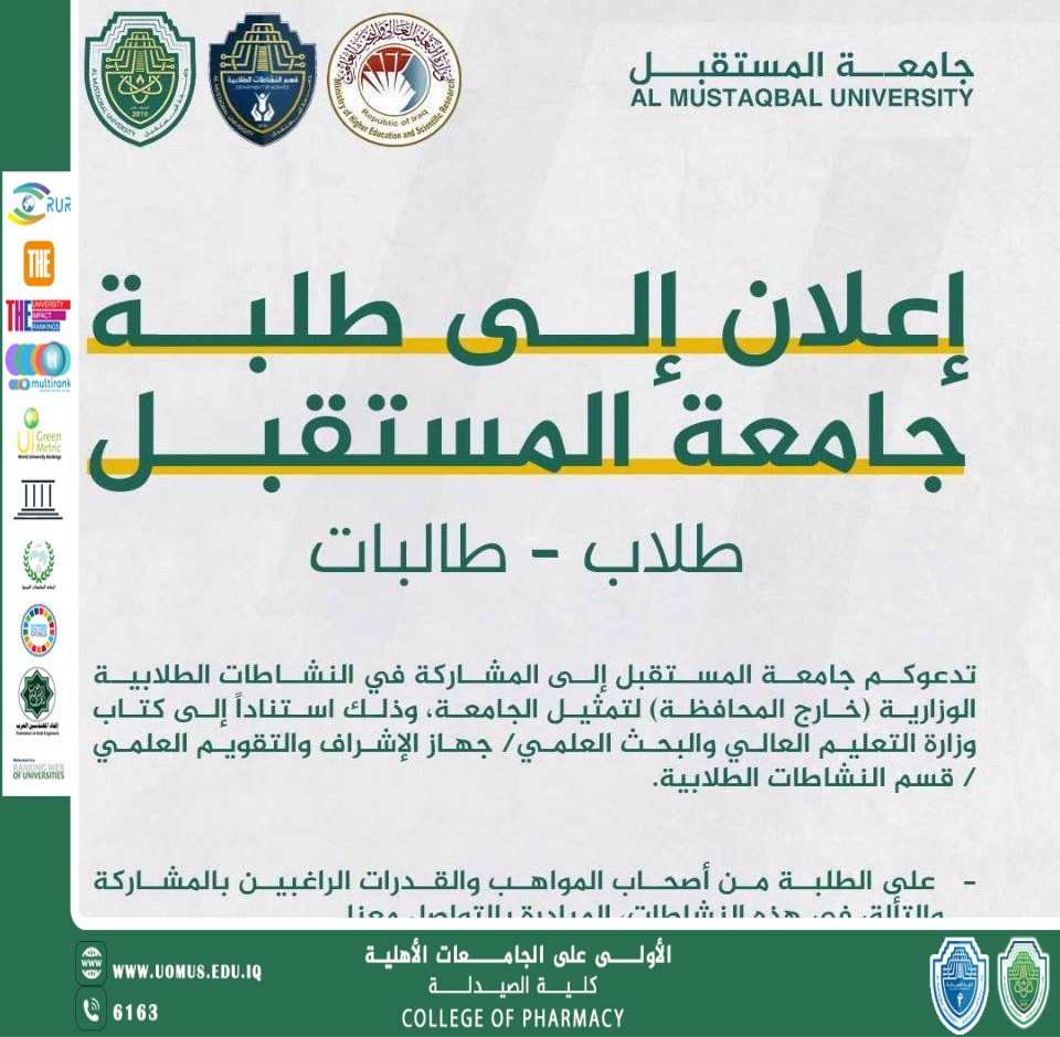 تنويه الى طلبة كلية الصيدلة ...جامعة المستقبل الجامعة الأولى في العراق...